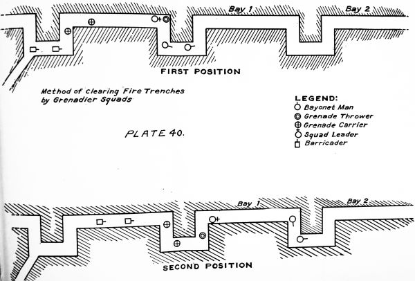Chapter VIII.—Grenade Warfare: Organization and tactics of grenadiers. Offensive operations. Clearing fire trenches. Clearing communication trenches. Night operations. Grenade patrols. Notes on grenade warfare |