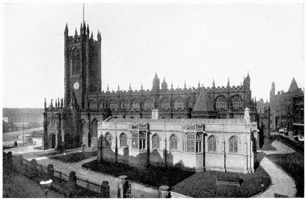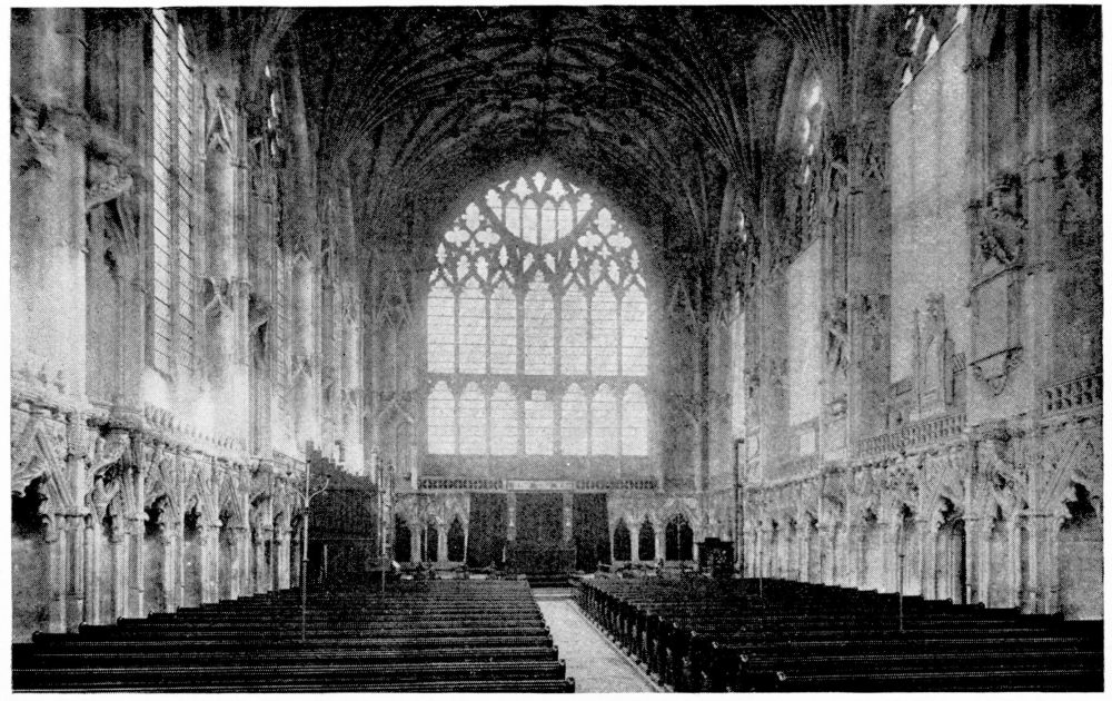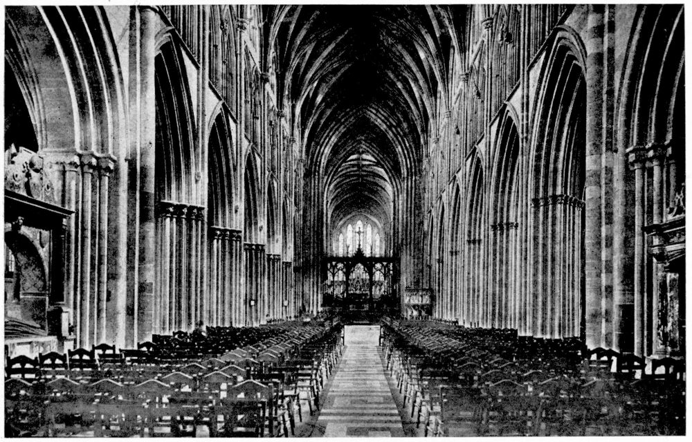 “As we see our cathedrals now, the view that meets us differs much from that which would have greeted us in mediæval times. Then all was ablaze with colours. Through the beautiful ancient glass the light gleamed on tints of gorgeous hues, and rich tapestries and hangings, on walls bedight with paintings, and every monument, pier and capital were aglow with coloured decorations. We have lost much, but still much remains. At the Reformation the avaricious courtiers of Henry VIII. plundered our sacred shrines, and carried off under the plea of banishing superstition vast stores of costly plate and jewels, tapestry and hangings. In the Civil War time riotous, fanatical soldiers wrought havoc everywhere, hacking beautifully-carved tombs and canopies, destroying brasses, and mutilating all that they could find. Ages of neglect have also left their marks upon our churches; and above all the hand of the ignorant and injudicious ‘restorer’ has fallen heavily on these legacies of Gothic art, destroying much that was of singular beauty, and replacing it by the miserable productions of early Nineteenth Century fabrication.”—(P. H. D.)