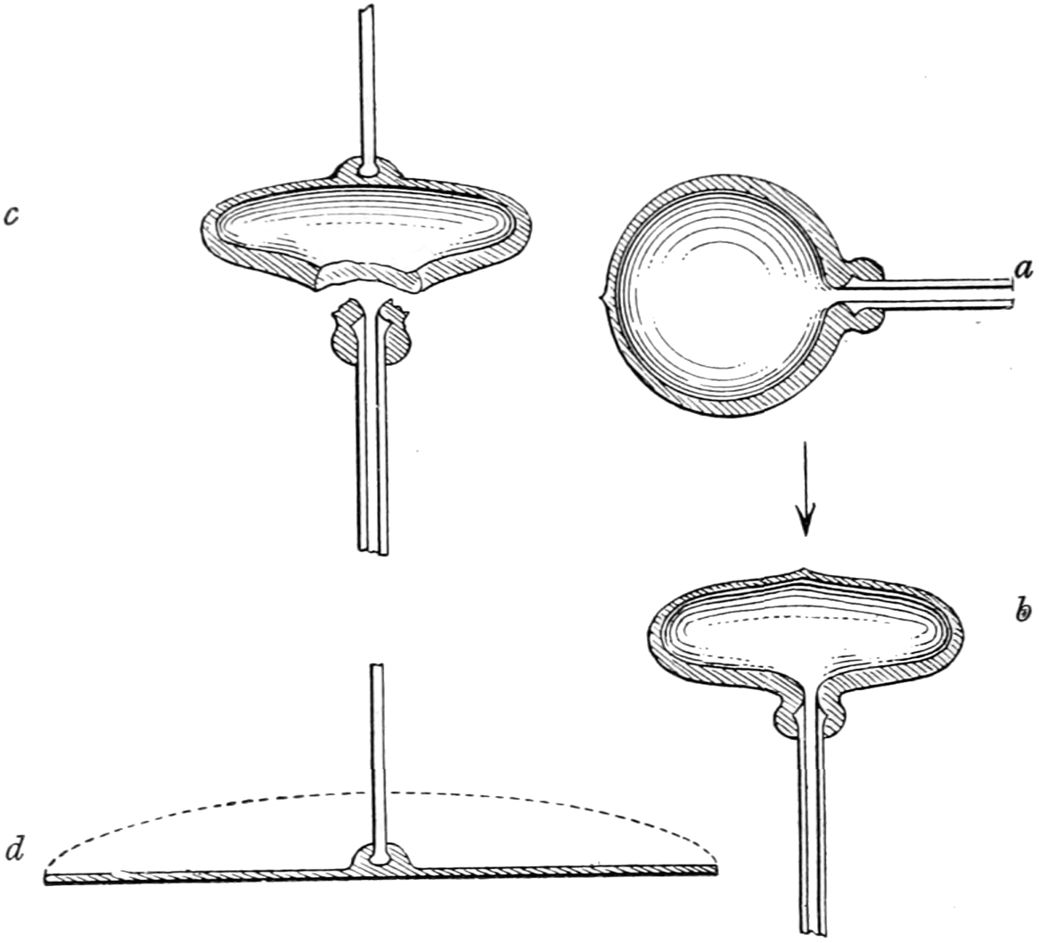 The cap of the cylinder at the blow-iron end is now cracked off. A thread of hot glass is wrapped round the shoulder near the cap, and the line chilled by using a curved, hook-shaped rod of iron. Whilst the cap is being cracked off, the cylinder is allowed to rest supported by a wooden cradle.