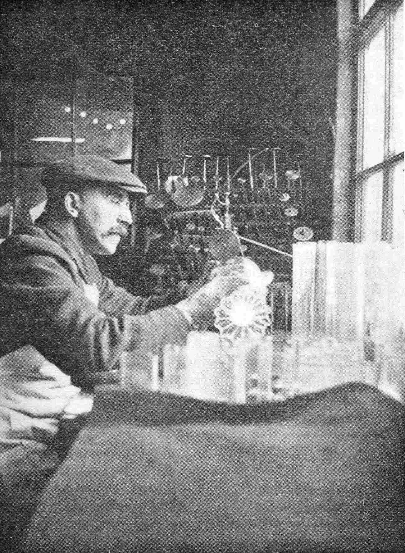 As the sheet becomes flat the workman levels it out with a flat block of charred wood called a polisher. This is attached to a long handle, and is rubbed over the face of the sheet of glass. The weight of the wooden block is just sufficient to smooth out any creases and assists in levelling out any irregularities of the surface. It is essential that the floor upon which the glass is resting 93should be perfectly smooth and level, and uniformly heated. As each sheet is levelled, it is removed to the annealing oven and afterwards stacked up until cool, after which the rectangular sheets are cut up to the various sizes required for window panes.