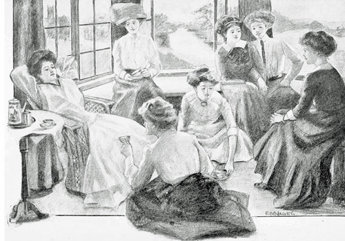 An hour later Betty shed her ritherum costume—it was rather warm, being composed of Georgia’s gym suit, the burlap that Lucille had bought to pack around her Morris chair, a peacock feather fan, and a pair of snowshoes for wings—and she and Madeline, Roberta, Rachel, K., Nita, Helen, the B’s, and Christy went out on the fire-escape to cool off and watch the other classes coming home.