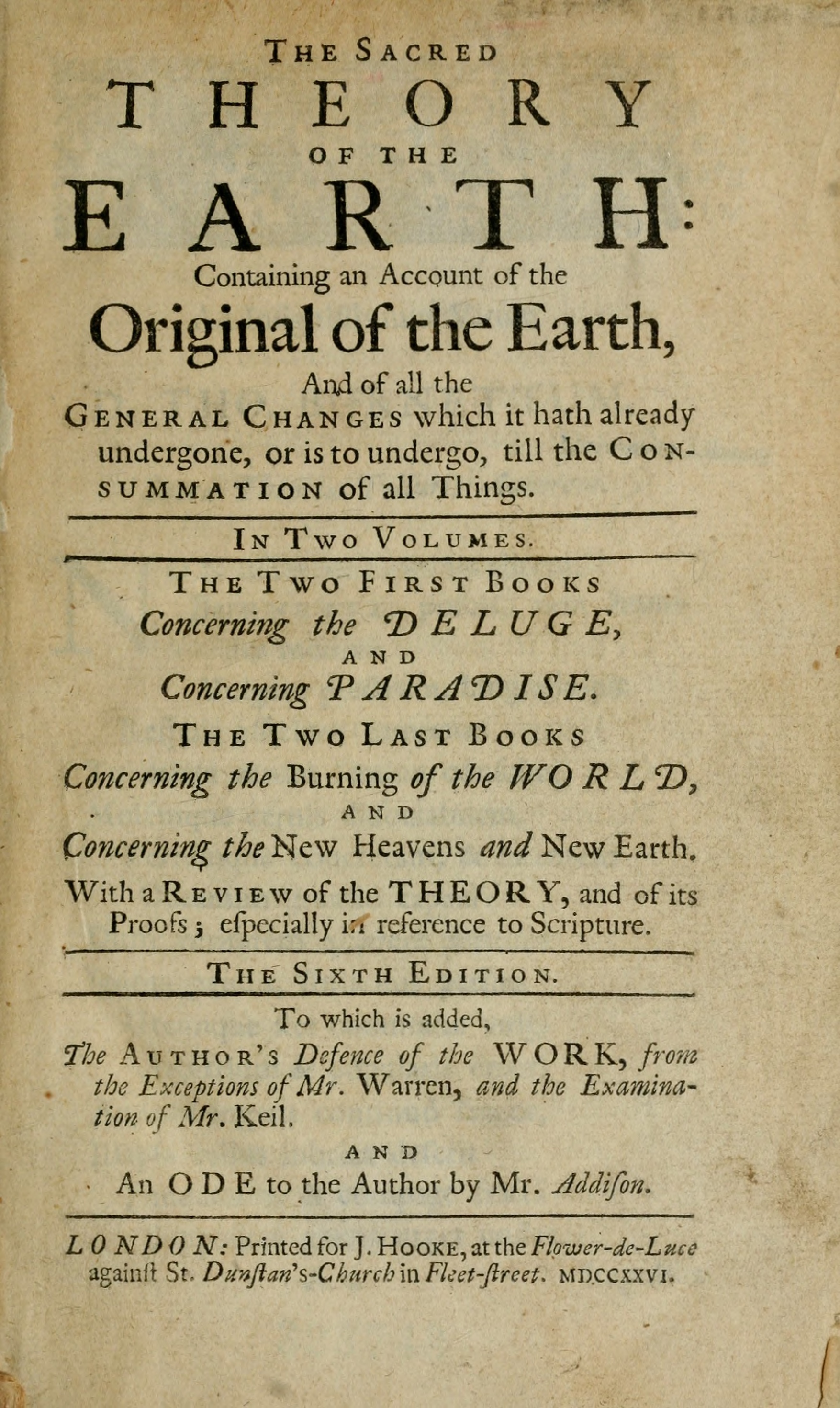 Having given an Account of this whole Work in the first Chapter, and of the Method of either Book, whereof this Volume consists, in their proper Places, there remains not much to be said here to the Reader. This Theory of the Earth may be called Sacred, because it is not the common Physiology of the Earth, or of the Bodies that compose it, but respects only the great Turns of Fate, and the Revolutions of our natural World; such as are taken notice of in the Sacred Writings, and are truly the Hinges upon which the Providence of this Earth moves; or whereby it opens and shuts the several successive Scenes whereof it is made up. This English Edition is the xviiisame in Substance with the Latin, though, I confess, ’tis not so properly a Translation, as a new Composition upon the same Ground, there being several additional Chapters in it, and several new-moulded.