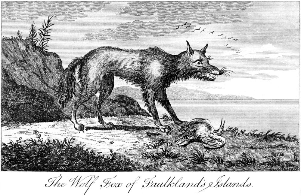 The Commodore was once unexpectedly attacked by a sea lion, and extricated himself from the impending danger with great difficulty: they had many battles with this animal, the killing of one of which was frequently an hour’s work for six men; one of them almost tore to pieces the Commodore’s mastiff dog, by a single bite. The Master having been sent to sound the coast, four very fierce animals ran after the boat’s crew till they were up to their bellies in water; so that they were obliged to put from the shore, as they had no fire-arms in the boat. The next day, on the opposite shore, Mr. Byron and his company saw a sea lion of an enormous size; and the crew, being well armed, instantly engaged him. While they were thus 18employed, one of the other animals posted towards them; but a ball being lodged in his body, he was instantly dispatched. Five of these beasts were killed this day, in their attempts to seize the men, whom they always pursued the moment they got sight of them. They were of a mixed shape, between a wolf and a fox; most like the latter, but of the size of the former. They burrow in the ground like a fox, feed on seals and penguins, and are very numerous on the coast. The sailors, in order to be rid of such disagreeable companions, set fire to the grass, which burnt so rapidly, that the country was all in a blaze for some days, and these animals were seen running to seek shelter from its fury.