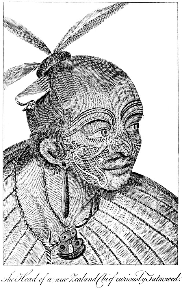 10Mr. Byron now advanced alone, but as he approached, the Indians retreated; he therefore made signs, that one of them should come forward, which was complied with. The person who advanced appeared to be a chief, and was very near seven feet in heighth: round one of his eyes was a circle of black paint, and a white circle round the other; the rest of his face was painted in streaks of various colours. He had the skin of a beast, with the hair inwards, thrown over his shoulders. The Commodore and the Indian having complimented each other, in language equally unintelligible to either, they walked together towards the main body of the Indians, few of whom were shorter than the height abovementioned, and the women were large in proportion. Mr. Byron made signs for them to sit on the ground, which they did, chanting in a most serious and melancholy tone. The eyes of any one face were never painted with the same colours; some being white and red, some black and red, and some black and white: their teeth were white and even; they were all dressed much alike; but that some of them wore a sort of boots, having a spur of peaked wood fastened to each heel.