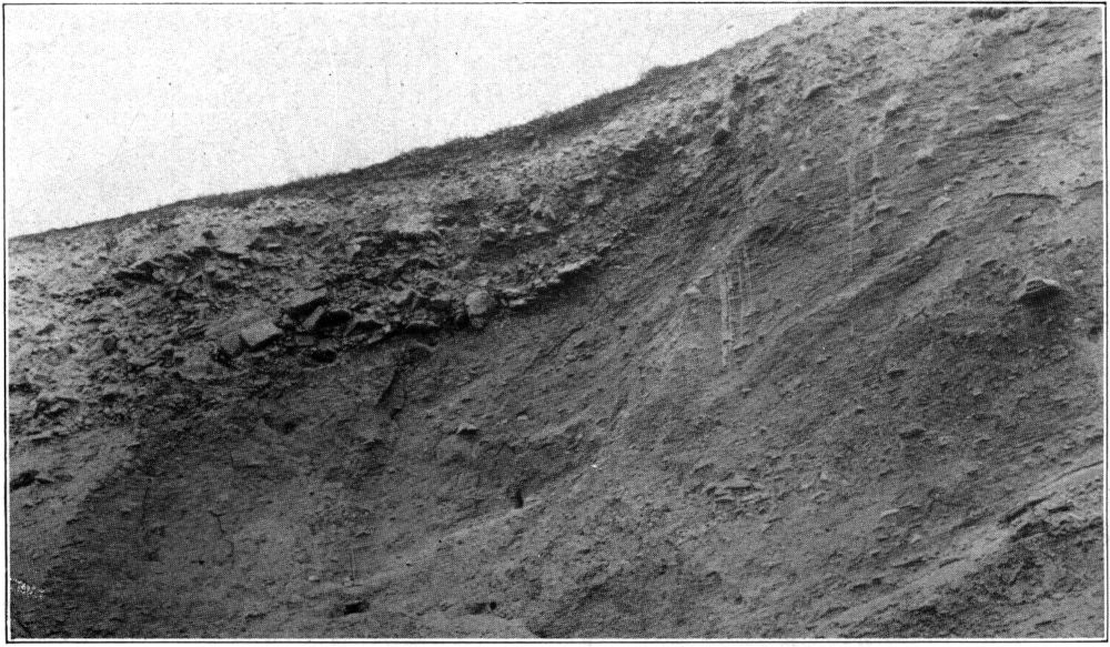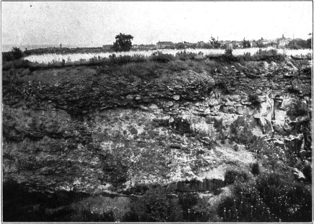 Aus der Tertiärzeit kennen wir im Gebiete des Plauenschen Grundes keine Gesteinsbildungen. Erst als die große Inlandeisdecke von Norden bis in unsere Gegend kam, wurden verschiedene Gesteinsabsätze gebildet, die uns noch heute erhalten sind. Ein schönes Beispiel für eiszeitliche Ablagerungen bietet uns die große Kiesgrube auf der Höhe westlich von Dölzschen. Sie zeigt uns im unteren Teile fast wagerecht geschichtete Flußsande, in denen erzgebirgische Gesteine und solche aus dem Norden mit dem Pläner aus nächster Nähe vermischt sind. Die Absätze stammen also aus jener Zeit, als das fließende Wasser eben erst die Kreidedecke durchschnitten hatte und noch in dieser Höhe floß. Im oberen Teile der Grube sehen wir Kiesmassen, die in steiler Schichtung offenbar von Norden über die senkrechte Sandsteinwand des von West nach Ost verlaufenden Flußtals hereingeschüttet worden sind (Abb. 17). Die Wassermassen, die den Sand hereingetragen haben, sind von Norden gekommen und können nur Schmelzwässer des herannahenden Eises gewesen sein. Über den Kiesen lagert, deren Schichtung abschneidend, ein dicht gepacktes, aber ungeschichtetes Haufwerk, das in der Hauptsache eckige Plänerstücke neben nordischen Fremdlingen aufweist. Es ist die Grundmoräne [103]des Eises, das wenige Meter zuvor beim Herabgleiten in das Tal der »Urweißeritz« die Pläner- und Sandsteindecke abgeschürft hatte. Umfang und Tiefe der Grube geben in gleicher Weise zu erkennen, daß die Sande in großen Mengen gewonnen werden; man verwendet sie zum Straßenbau und zur Mörtelbereitung. Ähnliche Sand- und Schotterablagerungen, allerdings bei weitem nicht in derselben Mächtigkeit, treffen wir auch gegenüber auf dem Rücken des Collmberges und in der Nähe der Heidenschanze an.