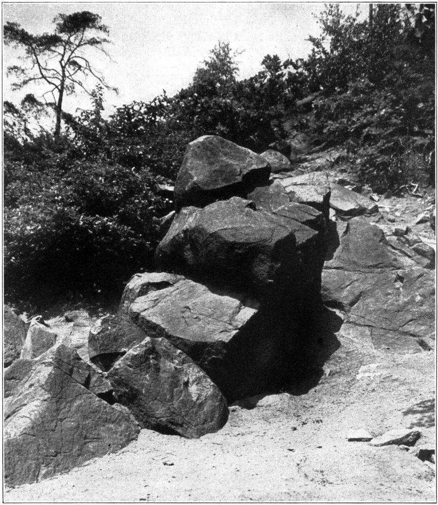 Mit einem Hinweis auf die Verwitterung wollen wir die Betrachtung des Syenits schließen. Während die staub- und rauchgeschwärzten Felsen beim Felsenkeller den Witterungseinflüssen gar nicht zugänglich zu sein scheinen, beobachten wir beim Ausgang des Engtales nach Potschappel zu in der Nähe der König-Friedrich-August-Hütte und an einigen anderen Punkten eine besondere Art der Verwitterung (Abb. 12). Frost und Sonnenbestrahlung, Regen und Wind, die Tätigkeit der Pflanzenwurzeln und in hervorragendem Maße chemische Vorgänge, die vor allem durch das Kohlenstoffdioxyd der Luft bedingt sind, haben hier zu einem Zerfall des Gesteins in einen sandigen Grus geführt, wobei einzelne abgerundete Felsgebilde stehengeblieben sind. Es ist dies eine Verwitterung, wie man sie sonst besonders beim Granit beobachtet und die man mit dem Namen »Wollsackbildung« bezeichnen kann. Die losgelösten Gesteinsbröckchen können natürlich leicht vom Winde, noch mehr aber vom Wasser fortgeschafft werden. Da jedoch eine solche Verwitterung nicht überall in gleicher Weise, immer aber nur mit außerordentlicher Langsamkeit erfolgt, [93]leistet der Syenit gegen die Abtragung durch das fließende Wasser einen sehr großen Widerstand. Wir erblicken darin die Ursache, daß die Weißeritz zwischen Potschappel und Plauen ein zwar tiefes, aber nur sehr enges und schmales Tal mit steilen, felsigen Wänden hat eingraben können.