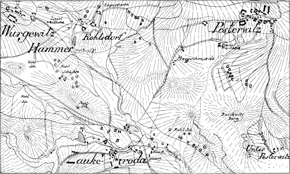 Wenn wir uns aber nach dem neunten Lichtloch des tiefen Elbstollns begeben – es befindet sich westlich vom Burgwartsberg in dem Tälchen, das von Pesterwitz nach Potschappel hinunterführt, und verrät sich durch eine Halde –, dann finden wir graue und violette Schiefer mit schwarzen Flecken und Knötchen, die beim Bau des Elbstollns aus der Tiefe herausgeholt worden sind. Diese Schiefer sind silurischen Alters, aber ihr seidenartiger Glanz und die dunklen Knötchen passen nicht zu ihrer ursprünglichen Beschaffenheit, sondern sind Umwandlungserscheinungen, hervorgerufen durch die Hitze des Syenits und durch die von ihm ausgehauchten Gase und Dämpfe. Diese Schiefer haben einst das Dach gebildet, unter dem der Syenit erstarrt ist. Der tiefe Elbstolln hat die Grenze zwischen Syenit und Schiefer durchfahren.