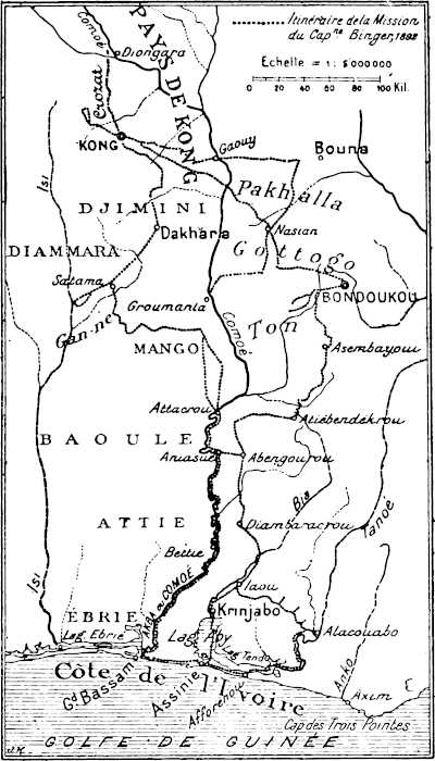 [9]Ce vœu a été exaucé. Un décret, en date du 10 mars 1893, enlevait l’administration de ces territoires au gouvernement des Rivières du Sud. — Le 20 mars, un autre décret nommait M. le capitaine Binger gouverneur de la Côte d’Ivoire.