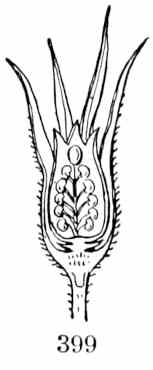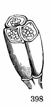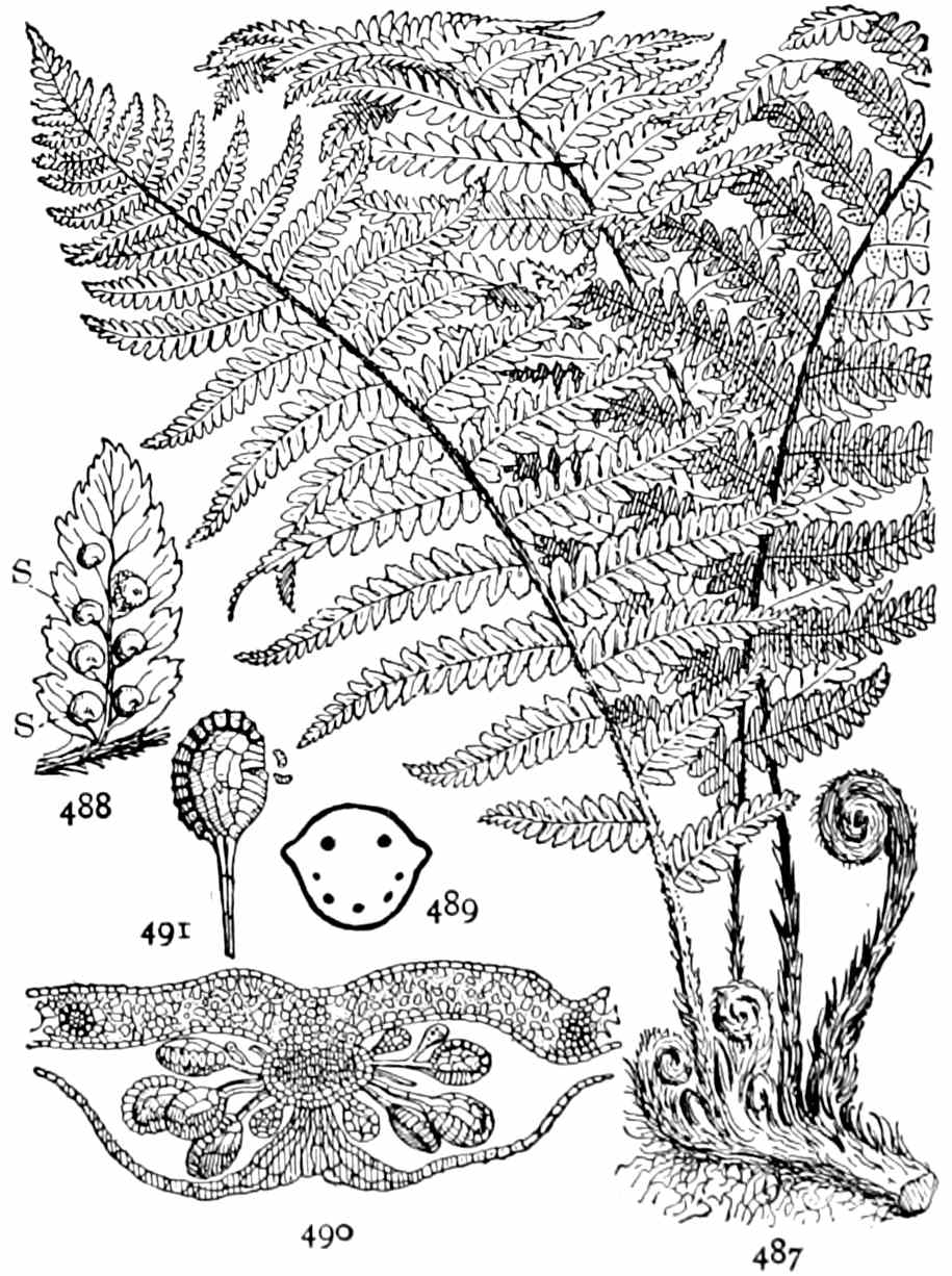414. Alternation of generations in seed plants.—This process, so conspicuous among Bryophytes and Pteridophytes, and not unknown among Thallophytes, is universal among seed plants (Spermatophytes) also, though in so masked a form that it is not easy to recognize without a more detailed study than would be practicable within the limits of a book like this. Briefly, we may say that the stamens of spermatophytes, and the pistils, or rather the carpels, which we have seen to be transformed leaves (298), represent the sporophylls (406) of the higher pteridophytes. The pollen sacs and ovules are sporangia, bearing microspores and megaspores (409), represented respectively by the pollen grains in the anther and the embryo sac in the ovule. These go through a series of microscopic changes in the body of the ovule analogous to the production of the oöspore in the archegonia of ferns and liverworts, but the process is so obscure that to an ordinary observer the pollen grains and the ovule appear to be the real gametes, and were long supposed to be such. The fertilized germ cell in the embryo sac (251) corresponds to an oöspore; the embryo sac with the endosperm found in all seeds (previous to its absorption by the cotyledons) is a rudimentary gametophyte; and the embryo in the matured seed is the undeveloped sporophyte, destined, after germination and further growth, to produce a new generation with its recurrent cycle of alternating phases.