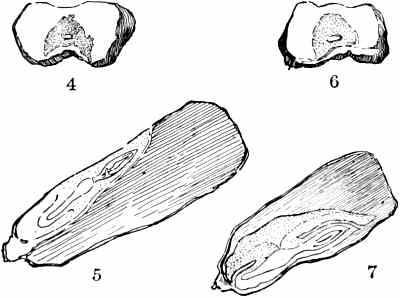 Figs. 4-7.—Sections of corn grains showing different qualities of food contents: 4, 5, small germ and large proportion of horny part, showing high protein; 6, 7, large germ and smaller proportion of horny part, showing high oil content.