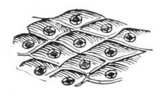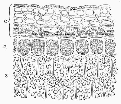 Fig. 10.—Transverse section near the outside of a wheat grain: e, the husk; a, cells containing protein granules; s, starch cells (after Tschirch).