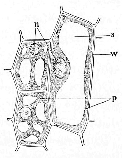 Fig. 11—Typical cells: n, nucleus; p, protoplasm; w, cell wall; s, sap.