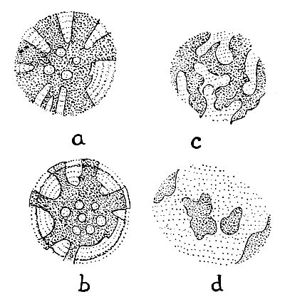 Fig. 12.—Starch grains of wheat in different stages of disintegration under the action of a ferment (diastase), accompanying germination: a, slightly corroded; b, c, and d, more advanced stages of decomposition.