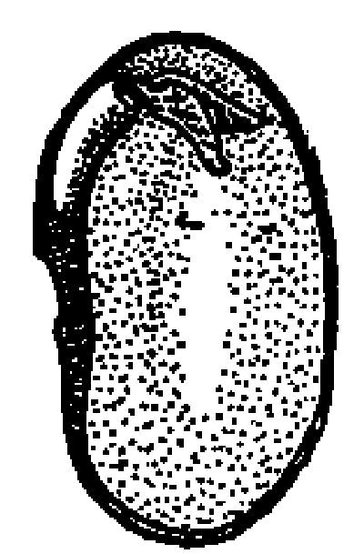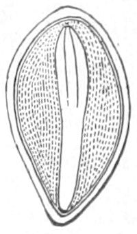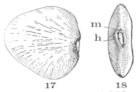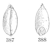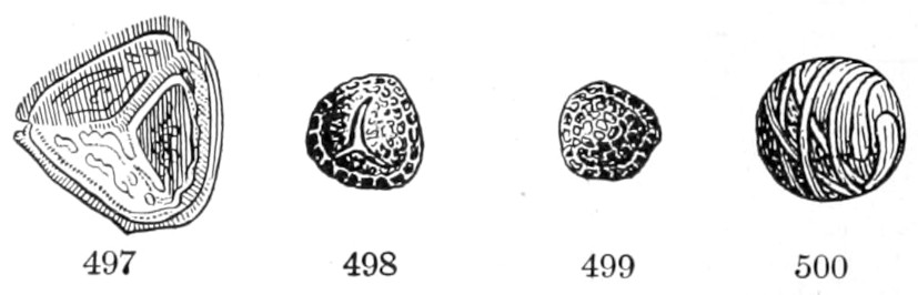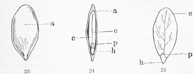 3. Food substances contained in seeds.—There are four principal classes of food stored in seeds: sugars, starches, oils, and proteins. The first are held in solution and can be detected, if in sufficient quantity, by the taste. The most important varieties of this group are cane and grape sugar, the latter occurring most abundantly in fruits, the former in roots and stems. Oil usually occurs in the form of globules. It is very abundant in some seeds, e.g. flax, castor bean, and Brazil nut. In the corn grain it is found in the part constituting the germ, or embryo (Figs. 6, 7). Starches and proteins occur in the form of small granules, which have specific shapes in different plants (Figs. 8, 9). Those containing proteins are called aleurone grains, and are, as a rule, smaller than the starch grains with which they are intermixed in the bean and some other seeds. In wheat, corn, rice, and most grains they form a layer just inside the husk, as shown in Fig. 10. This is the reason why polished rice and finely bolted flour are less nutritious than the darker kinds, from which this valuable food substance has not been removed. The two most familiar kinds of proteins are the albumins, of which the white of an egg is a well-known example, and the glutins, which give to the dough of wheat flour and oatmeal their peculiar gummy or “glutinous” structure.