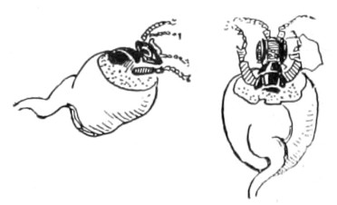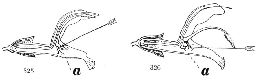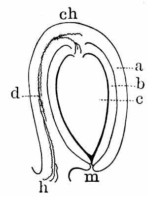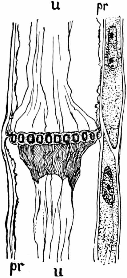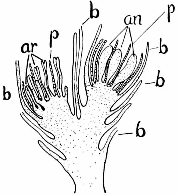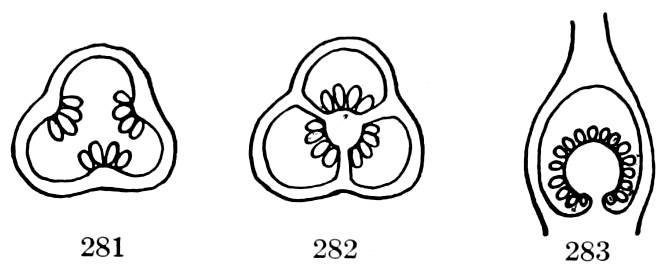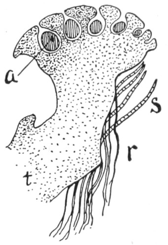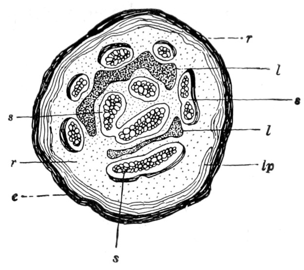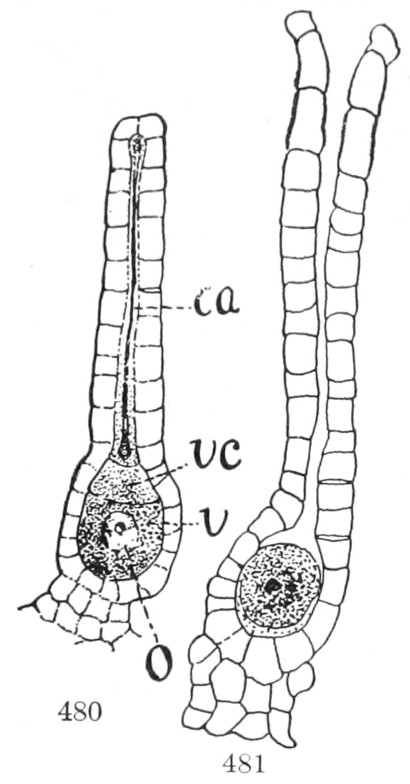 In the gymnosperms,—pines, yews, cycads, etc.,—which represent the most ancient and primitive type of existing seed-bearing plants, the similarity of these processes to those of certain of the pteridophytes is very striking, and it was through the study of these that the sequences of the process were traced in the much more obscure form in which they occur among the angiosperms. From the endosperm in the seeds of gymnosperms archegonia were found to be developed (Fig. 510) in much the same way as in Selaginella, from the prothallium, thus showing the endosperm to be a modified and greatly reduced gametophyte. In some cases, it has even been found to protrude a little way out of the embryo sac and to take on a slightly greenish tinge—another reminiscence of its origin. Fertilization, too, takes place in precisely the same manner as in the pteridophytes, except that in all but the ginkgo and the cycads, the fertilizing cells in the pollen grains are non-motile, and find their way to the ovule by growing down into the embryo sac with the pollen tube, instead of swimming to it—an adaptation probably brought about in response to changed condition during the course of evolution from aquatic to terrestrial life.