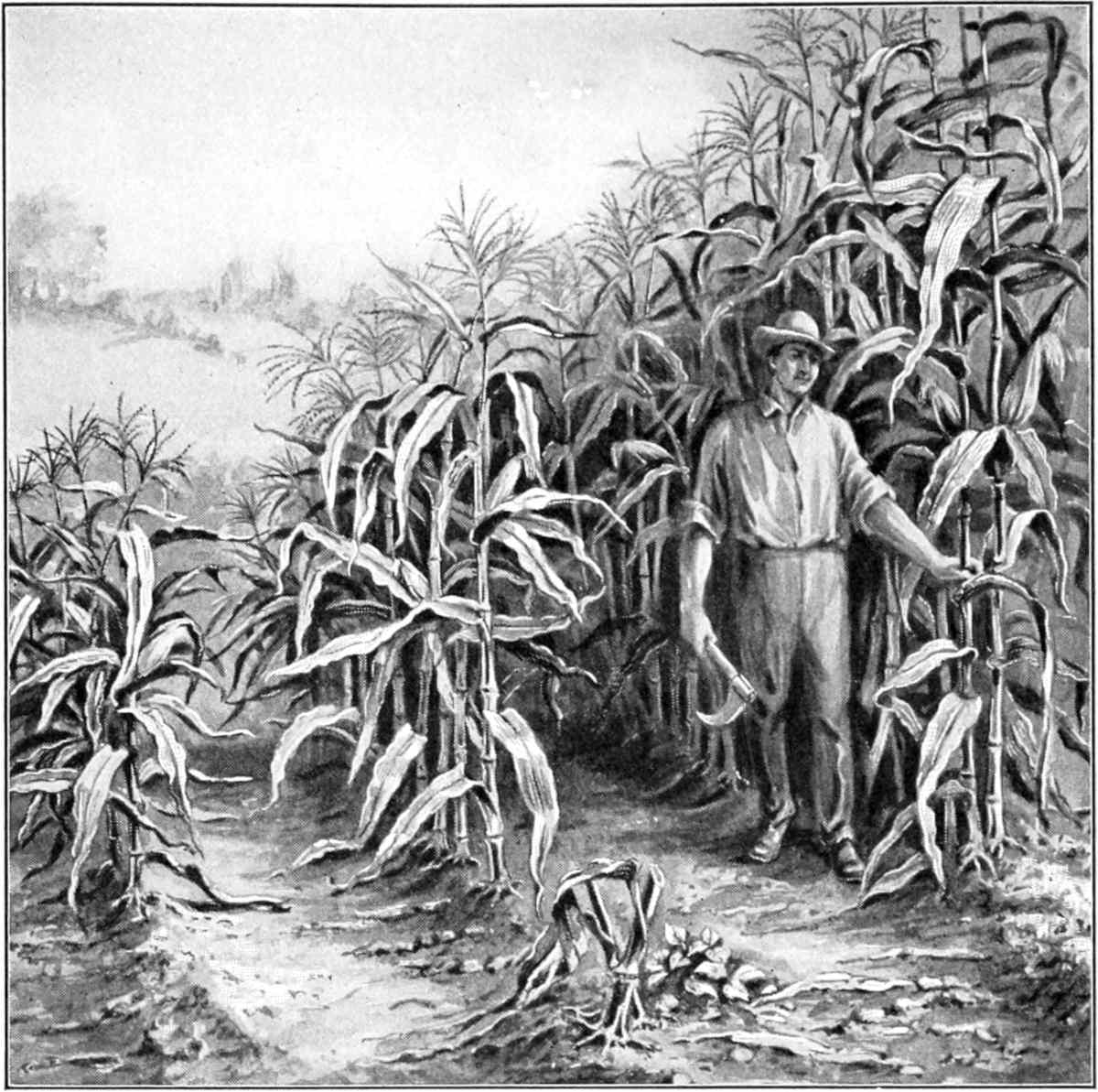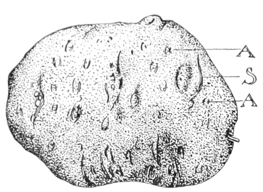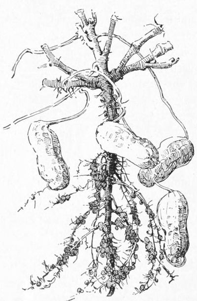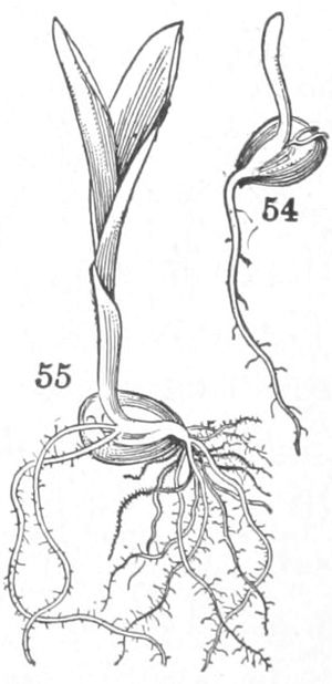 During the process of digestion the different kinds of food are acted upon and made soluble by certain chemical ferments, which are secreted in plants for the purpose. The digestion of starch, the most abundant of plant foods, is effected by diastase, a common ferment obtained from germinating[Pg 7] grains of barley, wheat, corn, rice, etc. By the presence of diastase starch is converted into grape sugar, a substance which is readily soluble in water, and which can be diffused easily through the tissues of the plant to any part where it is needed. In this way food travels from the leaf, where it is made, to the seed, where the sugar is generally reconverted into starch and stored up for future use, though sometimes, as in the sugar corn and sugar pea, it remains in part unchanged. The kernels of this kind of corn can be distinguished readily from those of the ordinary starch corn, after maturity, by their wrinkled appearance, owing to their greater loss of water in drying.
