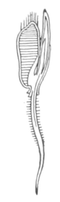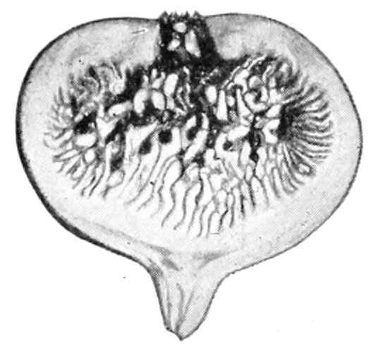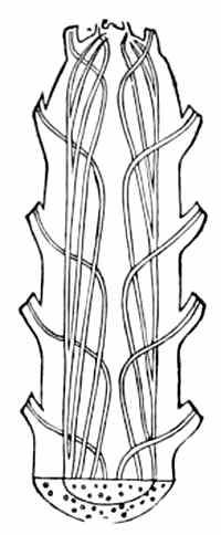 416. Significance of the sporophyte.—The gametophyte is obviously a more ancient and primitive structure than the sporophyte, which first becomes prominent in the ferns and[Pg 358] their allies. The sudden and violent break in the succession of vegetable life that accompanies the appearance of the pteridophytes (412) is probably to be explained by the development of a land flora and the necessity of adaptation to life in a new medium. The fact that no living cell, whether vegetable or animal, can absorb nourishment except in a liquid form, seems to point to an aquatic origin more or less remote for all life. This inference is further strengthened, in the case of plants, by the fact that even in so highly organized a group as the pteridophytes, fertilization cannot take place except in water. Such a requirement would manifestly be a great disadvantage to land plants, and one of the first steps in response to the demands of a new habitat would be to get rid, as far as possible, of the primitive gametophyte with its outgrown adaptations to a liquid medium, and to transfer the greater part of the work of reproduction to the asexual generation, in which the problem of fertilization did not have to be directly met, the asexual spores germinating without it. The greater the number of these produced, the better the chance that at least some of the gametes developed from them would meet the difficult conditions of fertilization, and the survival of the species be assured. At the same time, in order to meet the requirements of terrestrial life successfully, and to provide for continuing the sexual generation, correlative changes would have to take place in the gametophyte by which the increasing uncertainty of fertilization due to structural changes in the sporophyte, and the absence of a liquid medium for the conveyance of free swimming antherozoids would be avoided. This necessity has been met by the development of the pollen tube, which bores its way to the egg cell, carrying with it the generative cells, which in seed plants have taken the place of the more primitive antherozoids. With the concomitant reduction of the gametophyte and development of the seed habit, the adaptation to land conditions has been made complete.