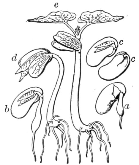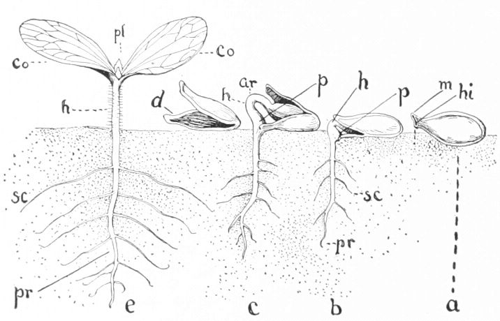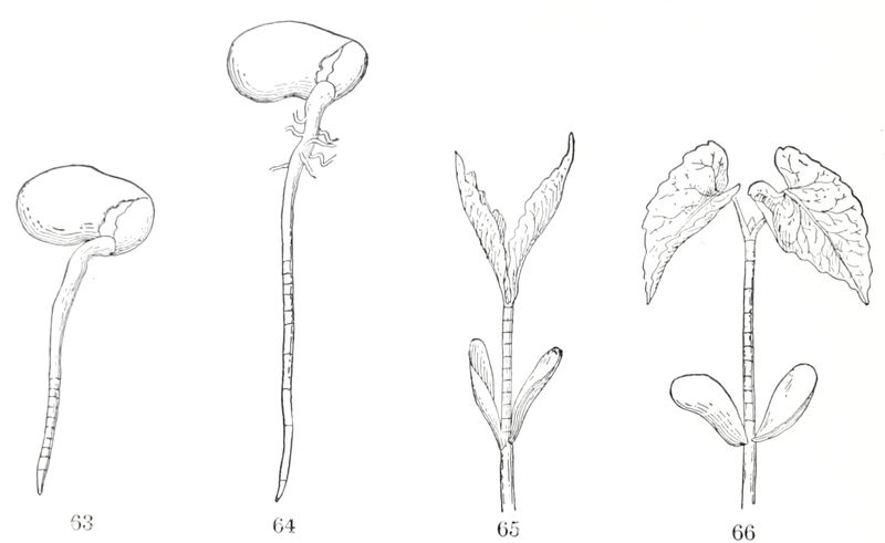 2. Why food is stored in seeds.—The one purpose for which plants produce their seed is to give rise to a new generation and so carry on the life of the species. The seed is the nursery, so to speak, in which the germ destined to produce a new plant is sheltered until it is ready to begin an independent existence. But the young plant, like the young animal, is incapable of providing for itself at first, and would die unless it received nourishment from the mother plant until it has formed roots and leaves so that it can manufacture food for[Pg 3] itself. Plants in general require very much the same food that animals do, and they have the power, which animals have not, of manufacturing it out of the crude materials contained in the soil water and in the air. Such of these foods as are not needed for immediate consumption, they store up to serve as a provision for the young shoot when the seed begins to germinate.