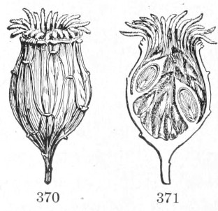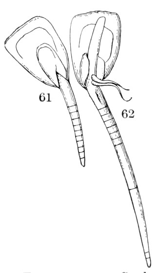 415. Disappearance of the gametophyte.—The seed is a comparatively recent development in plant evolution. It has no counterpart anywhere among the cryptogams, but is strictly characteristic of the three great orders of Spermophytes: Monocotyl, Dicotyl, and Gymnosperms, which compose the greater part of the vegetation of the globe. Structurally, it is a matured sporangium containing a rudimentary sporophyte (the embryo), and a reduced gametophyte (the embryo sac), which, under the form of endosperm, has dwindled to an insignificance that makes it difficult to recognize it as a phase in an alternation of generations.