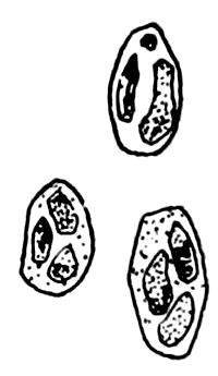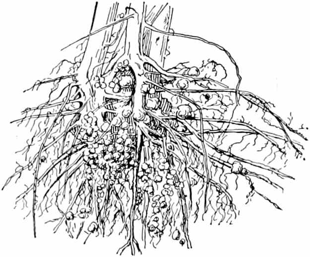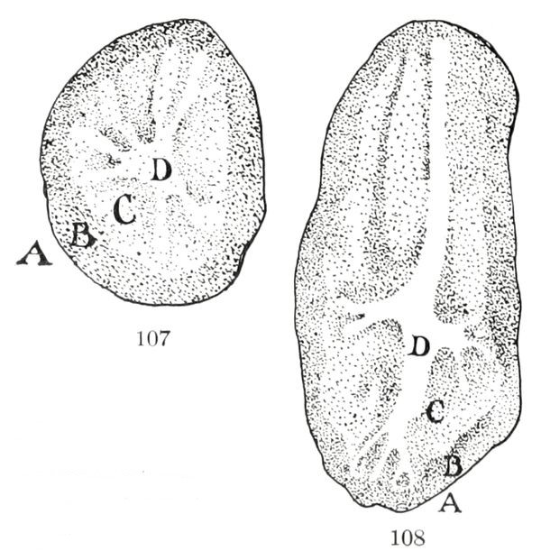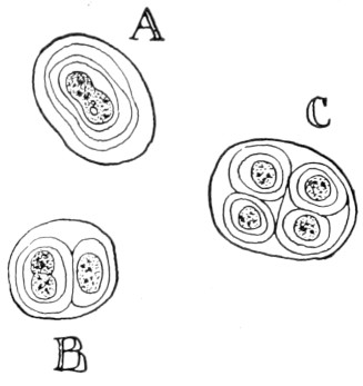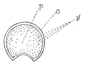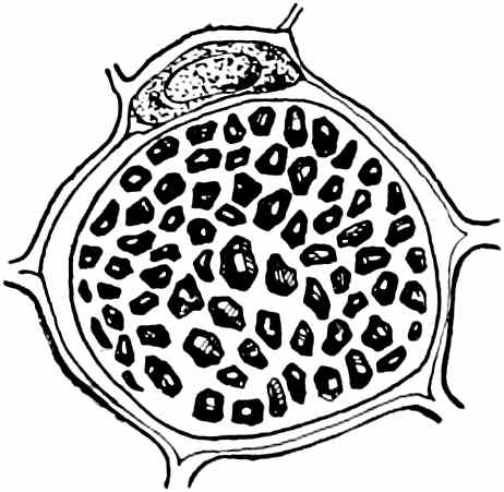 8. How food substances get into the cells.—As there are no openings in the cell walls, the only way substances can get into a cell or out of it is by soaking through the inclosing membrane, as will be explained in a later chapter. Since starch, oil, and proteins, the most important foods stored in seeds, are none of them soluble in the cell sap, it is clear that they could not have got into the cells in their present state, but must have undergone some change by which they were rendered capable of passing through the cell wall.