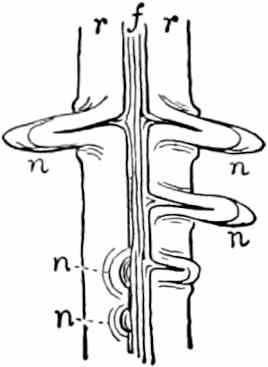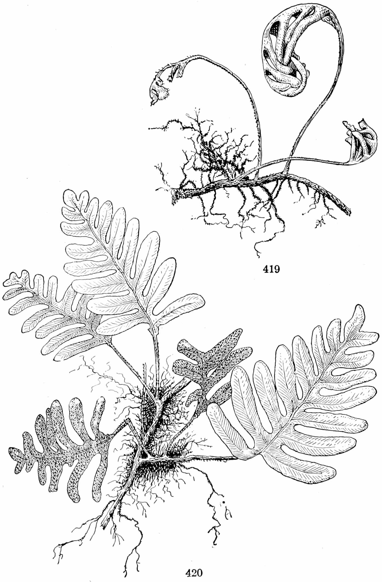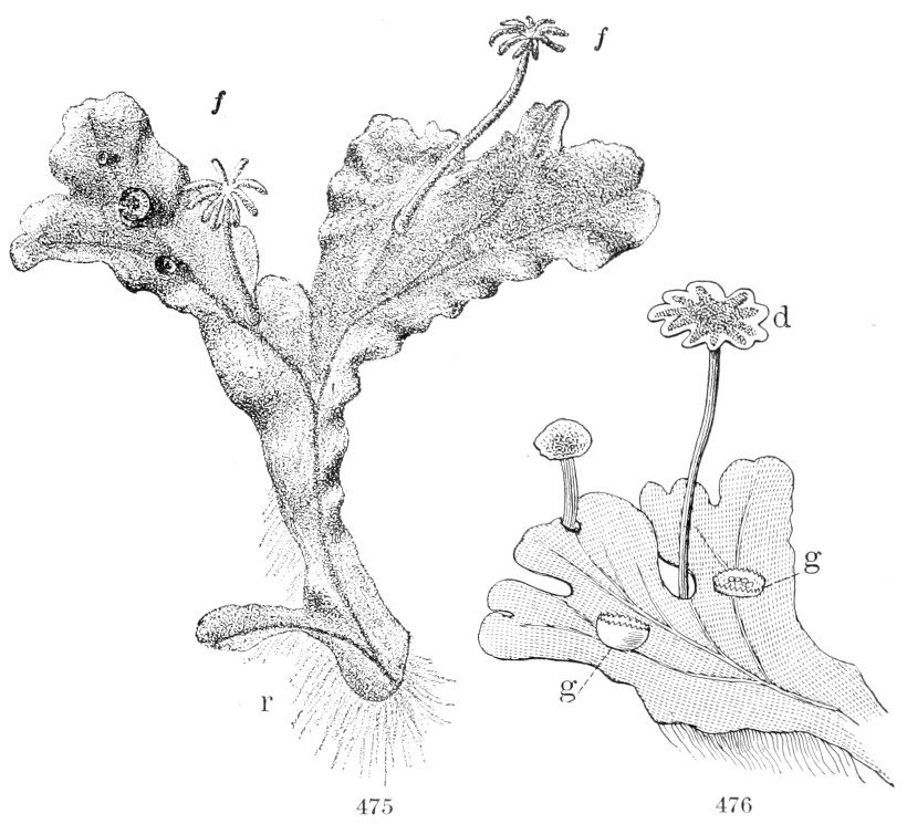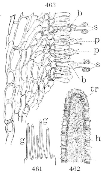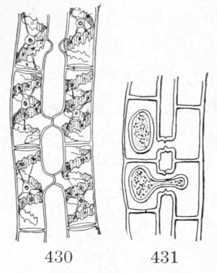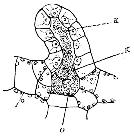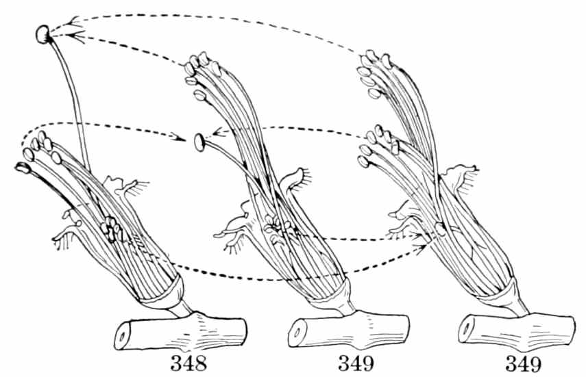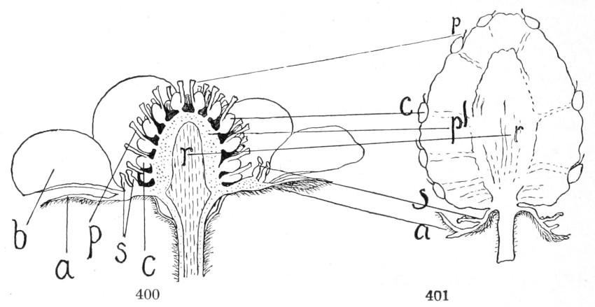 413. No break in the chain of life.—The great gap that was once supposed to exist between the cryptogams and phanerogams has been bridged over by the discovery of[Pg 355] analogies in the reproductive processes of the two groups that connect them together as successive links in one continuous chain of vegetable life. It is therefore very important to have a clear understanding of the nature and meaning of these processes, for the chief turning points in the life history of the different groups of plants are connected with them, their natural relationships to each other, and their distribution according to their respective places in the evolutionary scale, being determined largely by a comparison of their modes of continuing the life of the group.
