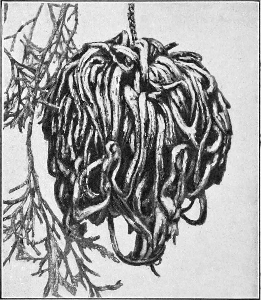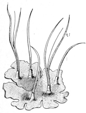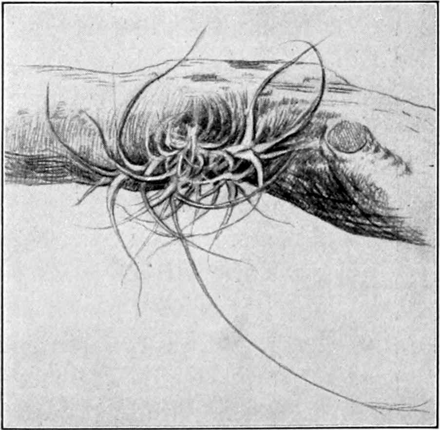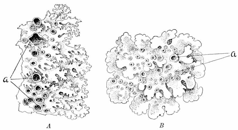 3. Observe the different kinds of lichens found in your walks and try to distinguish the three classes. Which kind are most abundant in your neighborhood? Which least so? Note the situations in which you find each kind growing, whether on stumps, trees, rocks, or the ground. Consider how the algæ and fungi aid each other in the different positions; could either, for instance, exist independently on bald rocks? Notice on what kind of trees the different lichens seem to thrive best and on which poorly or not at all, and whether the character of the bark—rough, smooth, scaly—has anything to do with their choice of a habitat.