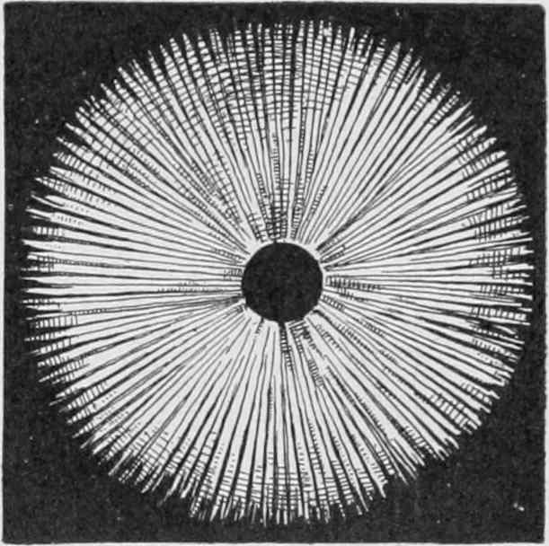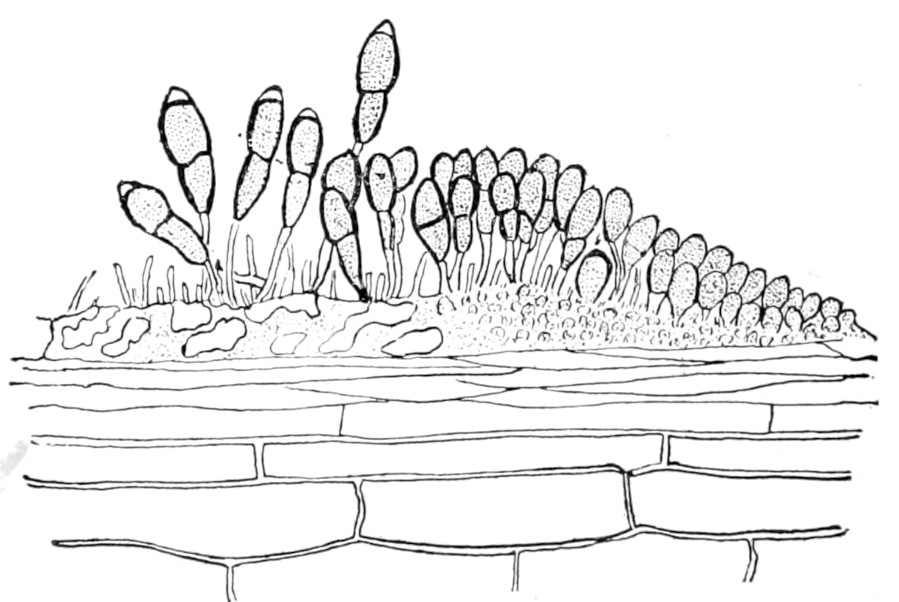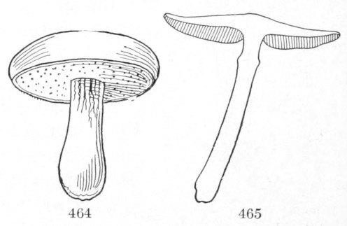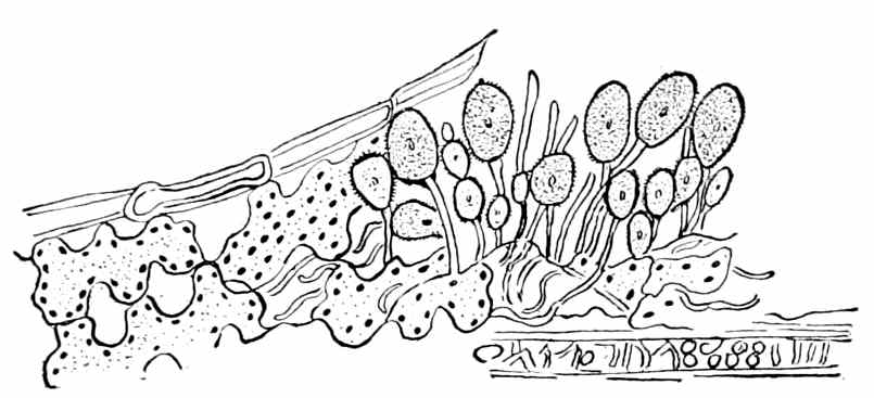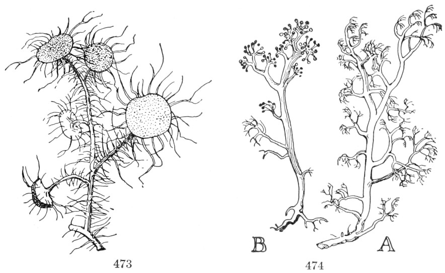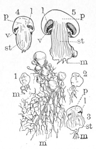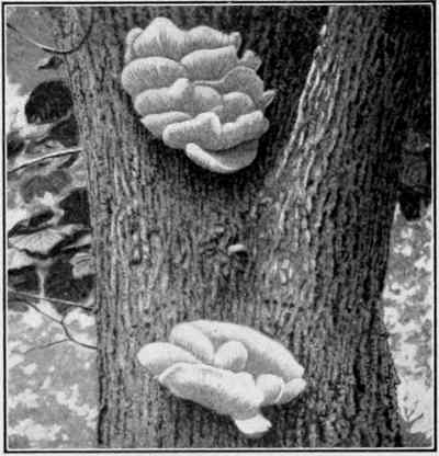 2. Notice the different kinds of mushrooms you find growing wild. Observe the difference between those that grow on the ground and those that grow on logs, stumps, and trees; between those found in the woods and those in open ground. Find out how those on the ground get their nourishment. Uncover the mycelium, and notice the extent of its surface.[Pg 363] Examine the soil and find out if it contains anything upon which they could feed. Note the prevalence of shelf fungi on trees. Examine the condition of the wood where they grow, and decide in what ways they injure their hosts. Notice whether they abound most on healthy or on decaying trunks and boughs, and decide whether this is because the fungus prefers that kind of host, or whether the injury it does causes the decay, or whether both causes operate together. Notice what fungi grow on different trees, and study their preferences in this respect.