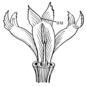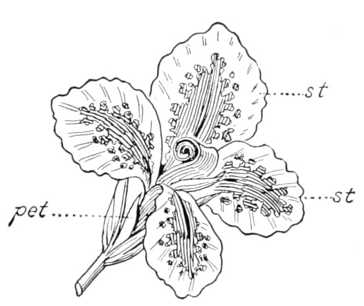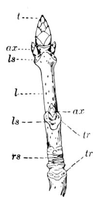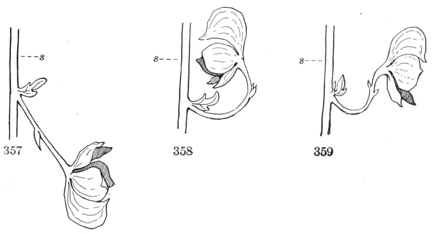 418. Retrogressive evolution.—While the general course of evolution has been upward and onward, the movement has not always followed a straight line, but, like a mountain road,[Pg 360] shows many windings and deviations from the direct route. The monocotyls furnish a conspicuous example of this departure from the general law of progression. It was formerly supposed, on account of their greater simplicity of structure, that they were a more ancient type than dicotyls, but recent investigations point to the conclusion that they are a later offshoot, derived from some primitive form of aquatic dicotyl, and represent, not an ancient and primitive stock, but a case of retrogressive evolution from a higher type. Strong presumptions in favor of this view are: (1) that various species of dicotyls show an unequal development of the seed leaves, amounting, in the bryony, to complete abortion of one of them, while some monocotyl seeds show morphological characters that can best be explained as survivals, or inheritances, from a dicotyl ancestor; (2) the structural resemblances between gymnosperms and dicotyls are closer than between gymnosperms and monocotyls, which could hardly be the case if the latter were the more ancient; (3) the geological record does not show them to have appeared before dicotyls; (4) the number of cotyledons furnishes no criterion as to the relative age of any plant group, since all three types are represented among the pteridophytes, where plants are found bearing one, two, or more cotyledons.