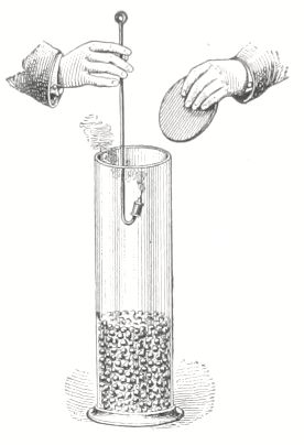Experiment 10. Do seeds in their ordinary quiescent state contain any water?—Place a number of beans, or grains of corn or wheat in a glass bottle, making a small perforation in the cork to allow the air to escape, and heat gently. Does any moisture form on the glass?