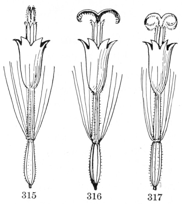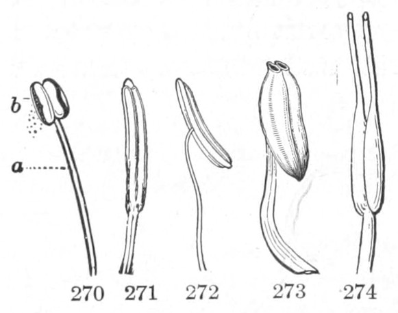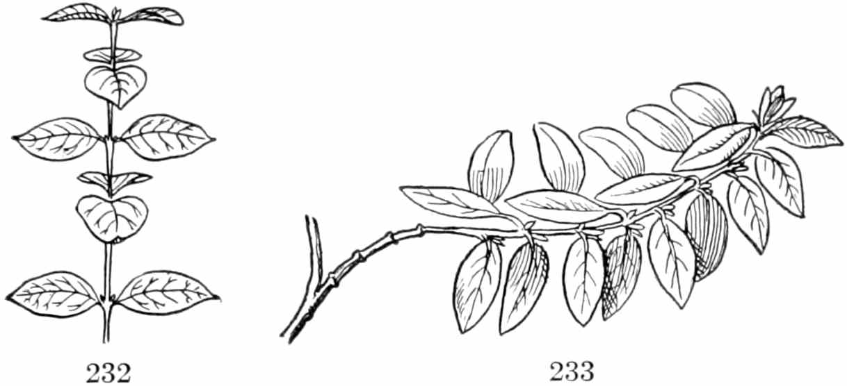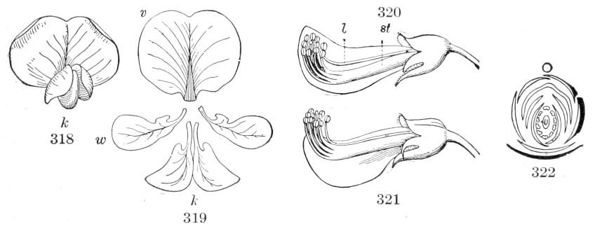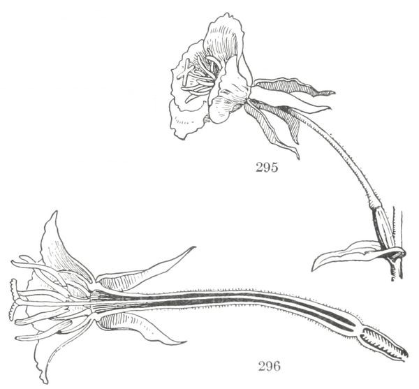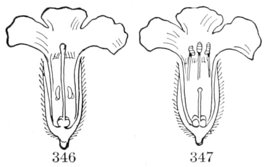 How to use the key.—Any good manual will answer the purpose. Gray’s “School and Field Book” is, perhaps, the best available at present for the states east of the Mississippi. Reference to the floral analyses in sections I-IV of Chapter VII will make its use clear. Suppose, for instance, we want to find out to what botanical species the morning-glory or the sweet potato belongs. Turning to the key, we find the sub-kingdom of Phænerogams—flowering or seed-bearing plants—divided into two great classes, Angiosperms and Gymnosperms, as explained in 18. A glance will show that our specimen belongs to the former class. Angiosperms, again, are divided into the two subclasses of Dicotyledons and Monocotyledons (18, 171). We at once recognize our plant, by its net-veined leaves and pentamerous flowers, as a dicotyledon (171, 229), and turning again to the key, we find this subclass divided into three great groups: Sympetalous (211), called also Monopetalous and Gamopetalous; Apopetalous, or Polypetalous (211), and Apetalous—having no petals or corolla. A glance will refer our blossom to the sympetalous or monopetalous group, which we find divided[Pg 366] into two sections, characterized by the superior or inferior ovary (218, 225). Further examination will show that the morning-glory belongs to the former class, which is in turn divided into two sections, according as the corolla is regular, or more or less irregular. We see at once that we must look for our specimen in the group having regular corollas. This we find again subdivided into four sections, according to the number and position of the stamens, and we find that the morning-glory falls under the last of these,—“Stamens as many as the lobes or parts of the corolla and alternate with them.” A very little further search brings us to the family Convolvulaceæ, and turning to that title in the descriptive analysis, we find under the genus, Ipomea, a full description of the common morning-glory, in the species Ipomea purpurea, and of the sweet potato in the species Ipomea batatas.