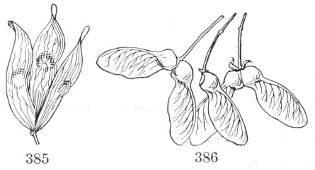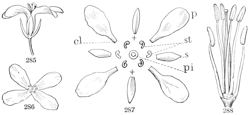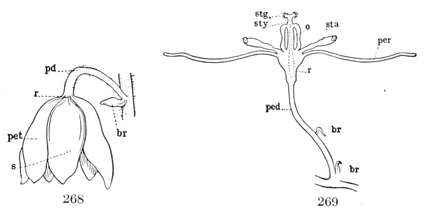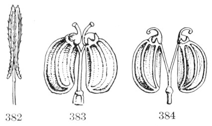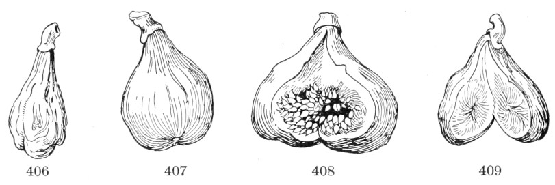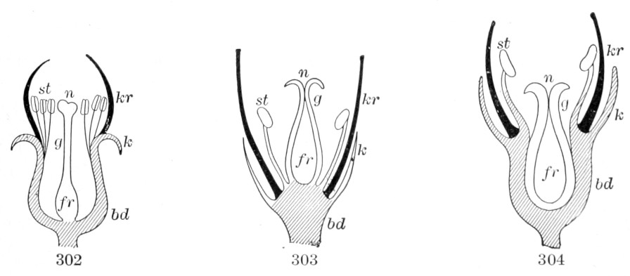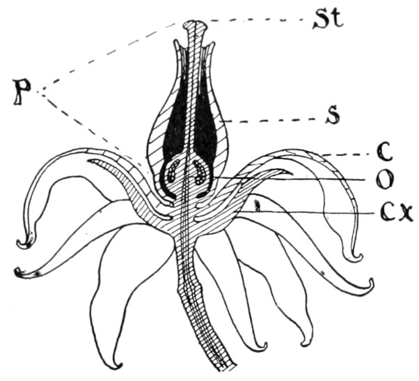 Principles of classification.—All the known plants in the world, numbering not less than one hundred and twenty thousand species of the seed-bearing kind alone, are ranged according to certain resemblances of structure, into a number of great groups known as families or orders. The names of these families are distinguished by the ending aceæ; the rose family, for instance, are the Rosaceæ; the pink family, Caryophyllaceæ; the walnut family, Juglandaceæ, etc. Each of these families is divided into lesser groups called genera (singular, genus), characterized by similarities showing a still greater degree of affinity than that which marks the larger groups or orders; and finally, when the differences between the individual plants of a kind are so small as to be disregarded, they are considered to form one species; all the common morning-glories, for instance, of whatever shade or color, belong to the species Ipomea purpurea. The small differences that arise within a species as to the color and[Pg 365] size of flowers, and other minor points, constitute mere varieties, and have no special names applied to them. The line between varieties and species is not clearly defined, and in the nature of things can never be, since progressive development, through unceasing change, is the law of all life.