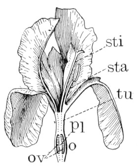 st, stamen; an, anther; pol, pollen; fc, food cells in pollen grain; gc, generative cell; p, pistil; ov, ovules; em, embryo sac; end, endosperm; ec, egg cell.