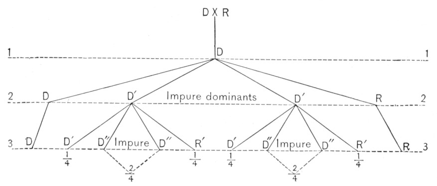 417. Plant genealogy.—It has been shown by a study of existing forms of plant life that there is no hard and fast line of division anywhere between the different groups, but that they are all connected by ties of kinship more or less defined, according to their distance from a common ancestral stock. The geological record points to the same conclusion, and our classification of them into families, orders, and species is merely a very imperfect genealogical table of their supposed pedigrees. This does not mean, however, that we can assert positively that such and such a species is derived from such or such another, but that both are descended from some common intermediate form more or less remote. While we have reason to believe that the flowering plants are derived through pteridophyte and bryophyte types from some of the green algæ, no direct connection has ever been traced between any particular kind of flowering plant and any particular kind of alga,—or between a liverwort and an alga, for that matter,—and probably never will be, because the intermediate forms die out, or pass on by variation into other lines of development. But while this is true, all the evidence we possess does go to show that, since the beginning of life on the globe, there has been a general progressive evolution from lower and simpler to higher and more complex forms.