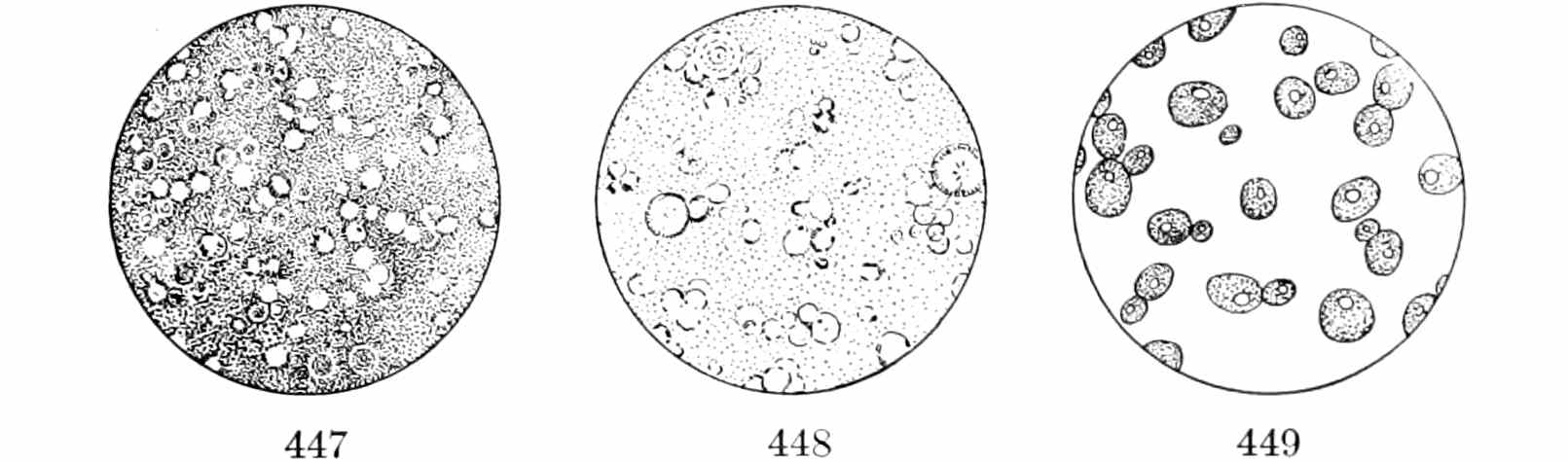 Experiment 8. To show how starch is disintegrated in the act of digestion.—Place a few grains of starch on a slide, add a drop or two of diastase solution, and observe under the microscope; the starch granules will be seen to disintegrate and melt away. Even with a hand lens it can be seen, from the greater clearness of the liquid in comparison with a mixture of untreated starch and water, that the grains have been dissolved.