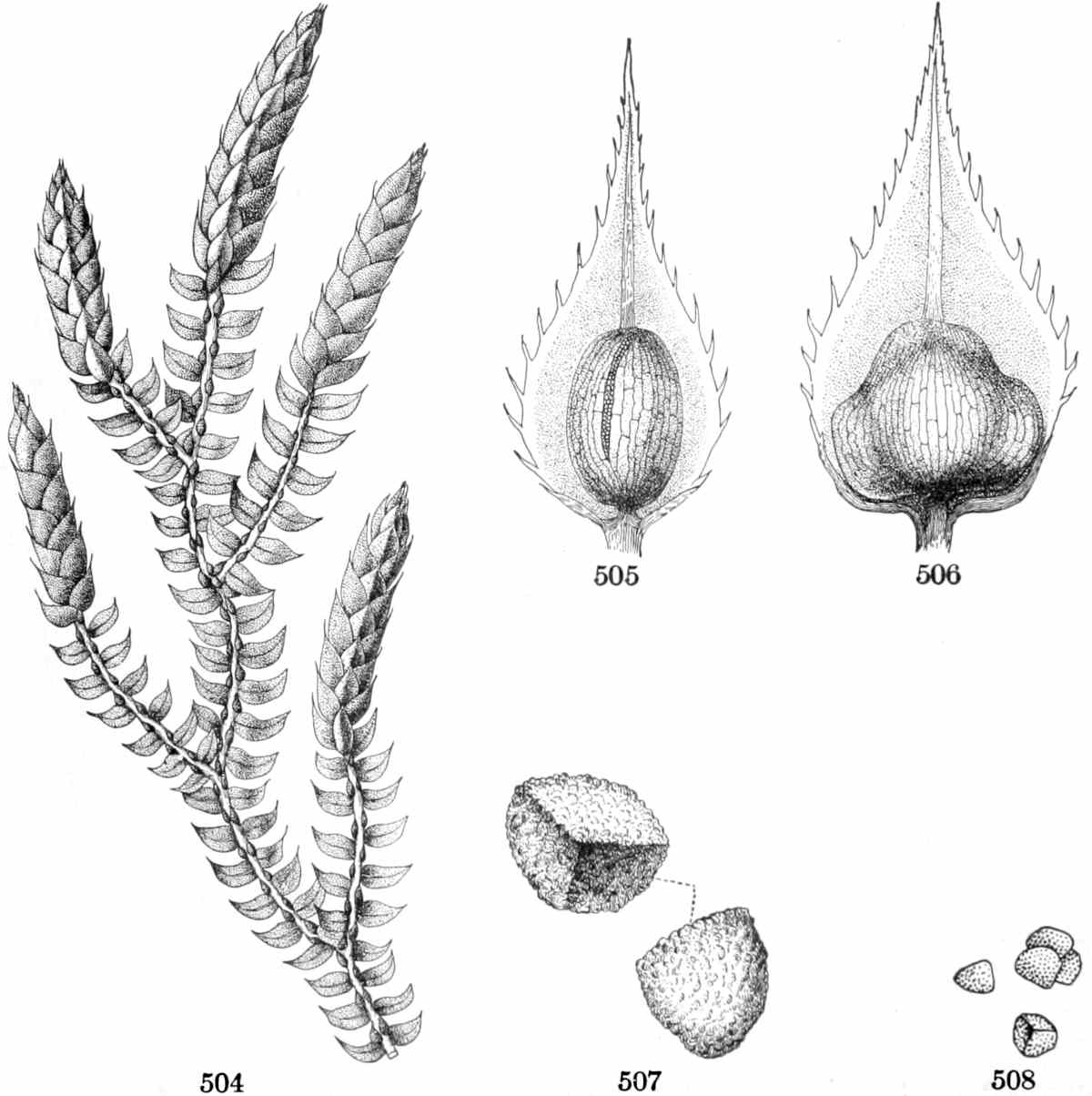 mospl, microsporophyll; mic, microsporangium; mo, microspores; anG, male gametophyte; ant, antheridia; mg, antherozoids. The letters in the lower line stand for the corresponding female organs.