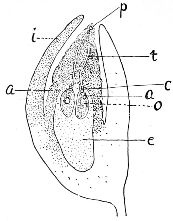Fig. 510.—Diagrammatic section through the ovule of a gymnosperm belonging to the spruce family: i, integument covering the ovule; e, endosperm (corresponding to female gametophyte), which fills the embryo sac, containing two archegonia, a; o, egg cell; p, pollen grains; t, pollen tubes entering the neck, c, of the archegonia.