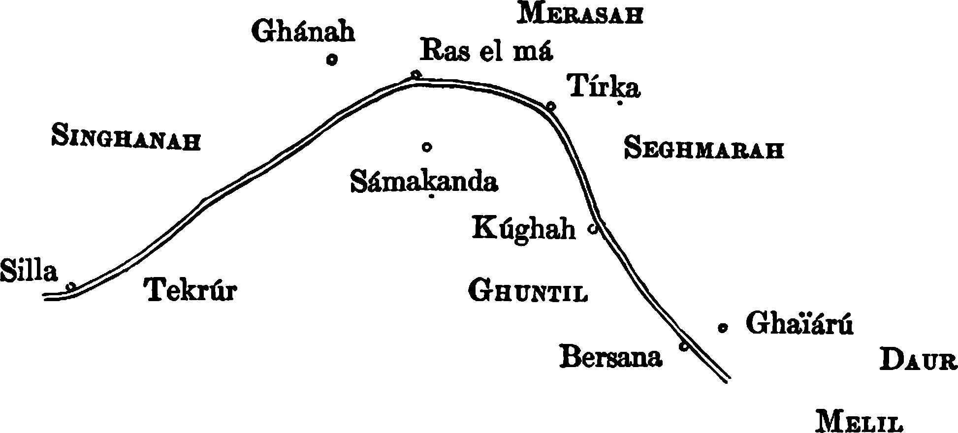 [8]The position of Támedelt, the starting point of the caravans to Negroland, must be in the first place determined. That town is stated to have been five days westward (or, we must rather suppose, south of westward) from Darʿah, and six days south-eastward from Iklí, the capital of Sús, which town, situate on a river flowing northward, was two days from Mésah and five from Wád Nún. Now the capital of Darʿah was five days distant from Sijilmésah, which was nine ordinary journeys from Fez.[13] Támedelt was therefore twenty days from Fez, by the road on the eastern side of the mountains, and it was also six days south-eastward from Iklí, which town must accordingly be so placed within five days of Wád Nún, and two days northward from the river of Mésah, as to allow Támedelt a somewhat westerly bearing from Darʿah. These conditions being fulfilled, the position of Támadelt will be nearly in lat. 28° 45′ N., long. 7° 10′ W., and not far from the modern Tatta.[14] The position thus assumed, though not quite free from uncertainty, will yet involve no inaccuracy capable of endangering the argument depending on it.