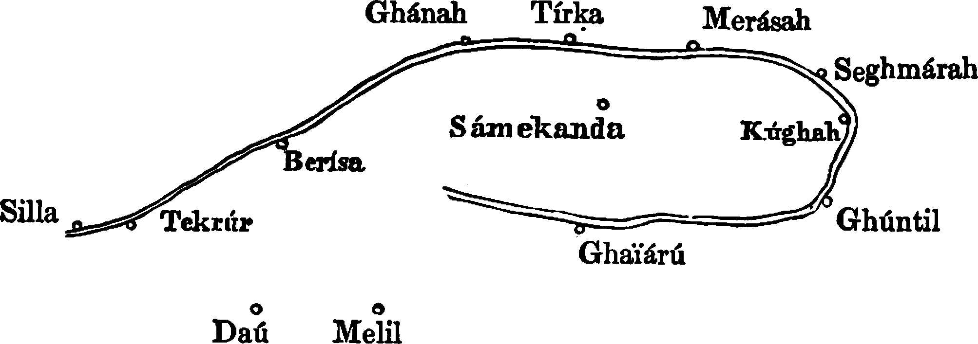 | Támedelt — Route to Aúdaghost — Line of Drifting Sands — Position of Aúdaghost — Route to Ghánah — The Desert — Tíser — Azawad — The Zenágah — Genéwah — Lumtúnah — Goddálah — Aúlil — Trade of Aúdaghost — Aúkar — Sínghánah — Tekrúr — Tádmekkah — River of Ghánah — Samaḳanda — Ghaïárú — Bokmo — Manners of Ghánah — Ghánah near the site of Tomboktú | 5 |