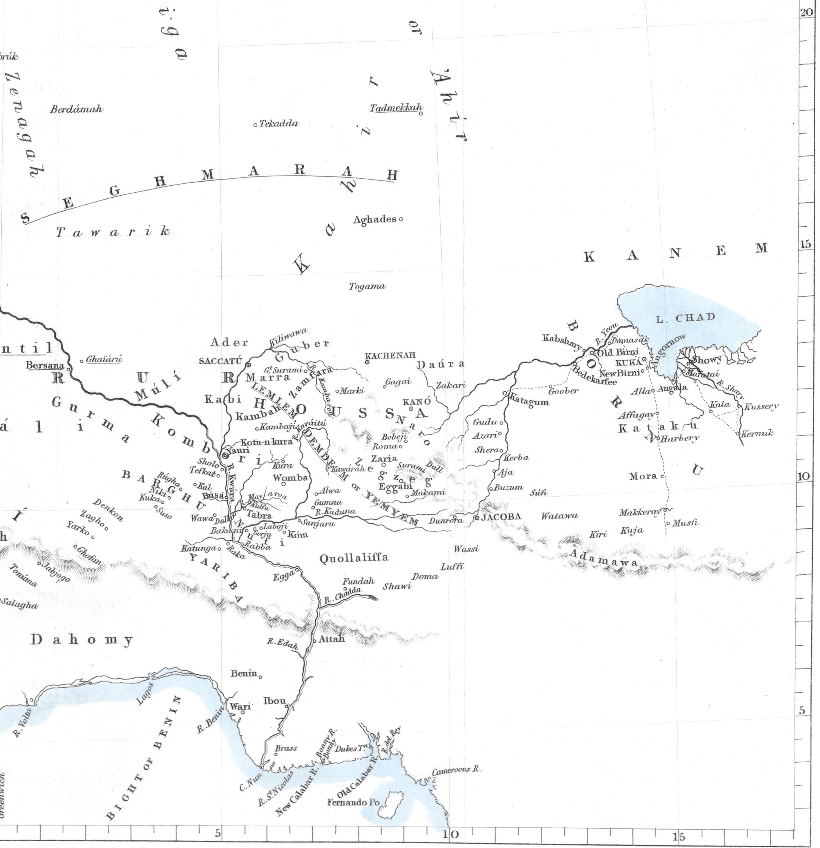 In considering the interpretation here offered of Makrízí’s statement, less weight is to be allowed to the resemblance of names than to the order, coherence, and accordance with probability which the whole passage acquires from the mode of viewing it. Some points in it may be obscure; but others, as Afnú and Katagum, hardly admit of doubt; and we feel justified, therefore, in concluding that the nations or countries, as Kaúkaú, Baḳárah, Tekrúr, &c., which Makrízí (copying Ibn Sʿaíd) arranges west of Kánem, are all excluded from the region above described—that is to say, from Bornú and the hills of Baúshí and Houssa immediately encompassing it on the west.