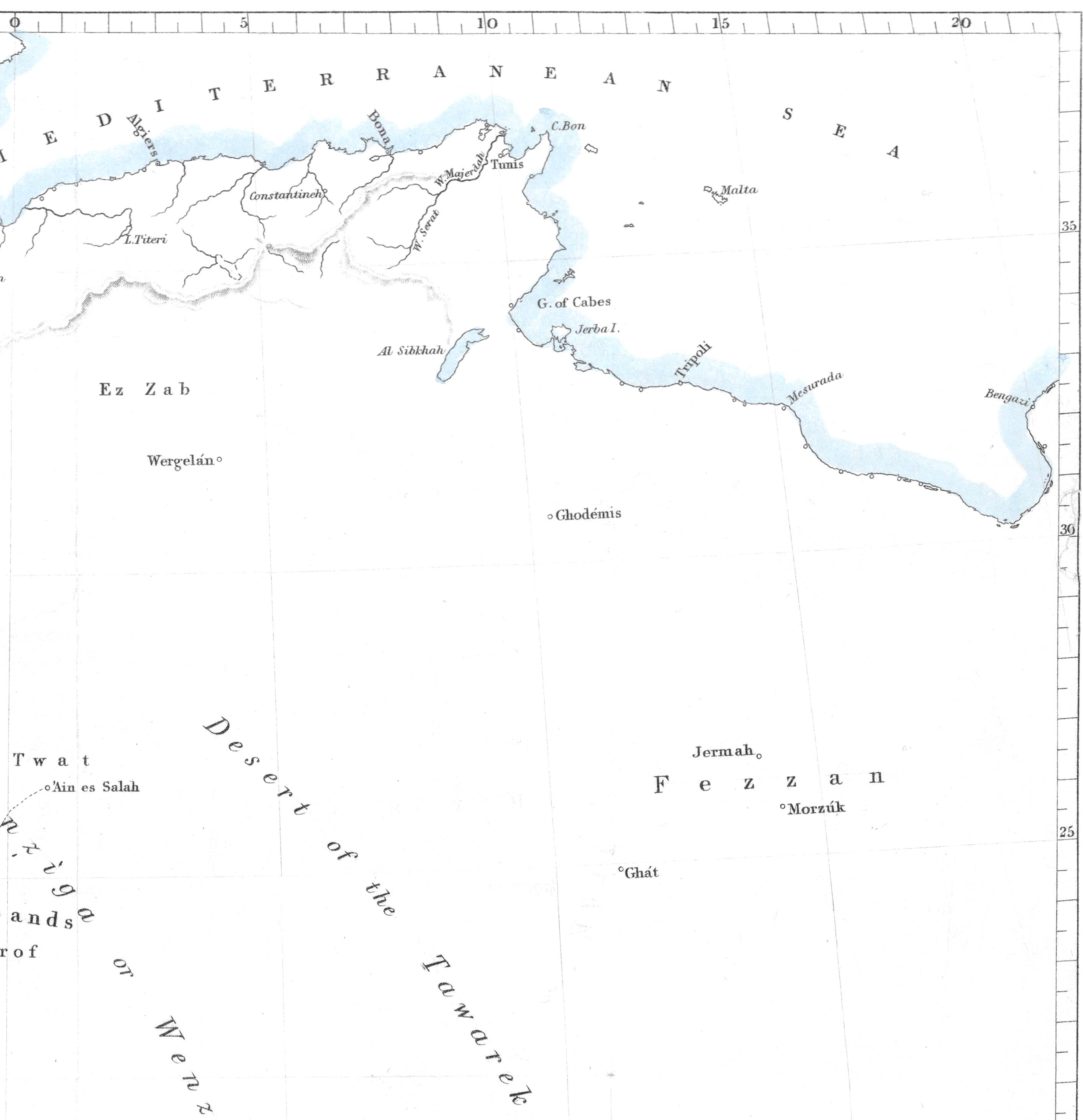 But it will naturally be asked, is there such a tract of peculiarly arid desert on the road to Tomboktú? Certainly there is; a desert of like extent, presenting the same physical character, and occupying a similar position in the route. Ibn Baṭúṭah, on his way from Sijilmésah to Tomboktú, arrived at Tegháza, near the edge of the desert, in twenty-five days. In ten days more, he came to the wells, or rather muddy pools of Táserahlá, where the caravan halted to prepare for the march over the formidable waste of sand, which it required ten days to traverse in order to reach Aïwalátin, a town on the southern border of the Ṣaḥrá.[33] Had that traveller crossed[16] obliquely from Táserahlá to Tomboktú, he might perhaps have found the waterless desert to exceed a ten days’ journey in extent. But towards the east its width seems to diminish; whether it be that the northward course of the Great River, or the chain of mountains determining that circuit of the stream, and stretching across into the desert, modifies the atmosphere so as to give a greater range to the periodic rains in that meridian, we have no means of deciding. But the whole of the western Ṣaḥrá and the peculiar tract under consideration, are described by Leo Africanus in the following manner:—
