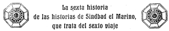 | LA SEXTA HISTORIA DE LAS HISTORIAS DE SINDBAD EL MARINO, QUE TRATA DEL SEXTO VIAJE | 140-155 |