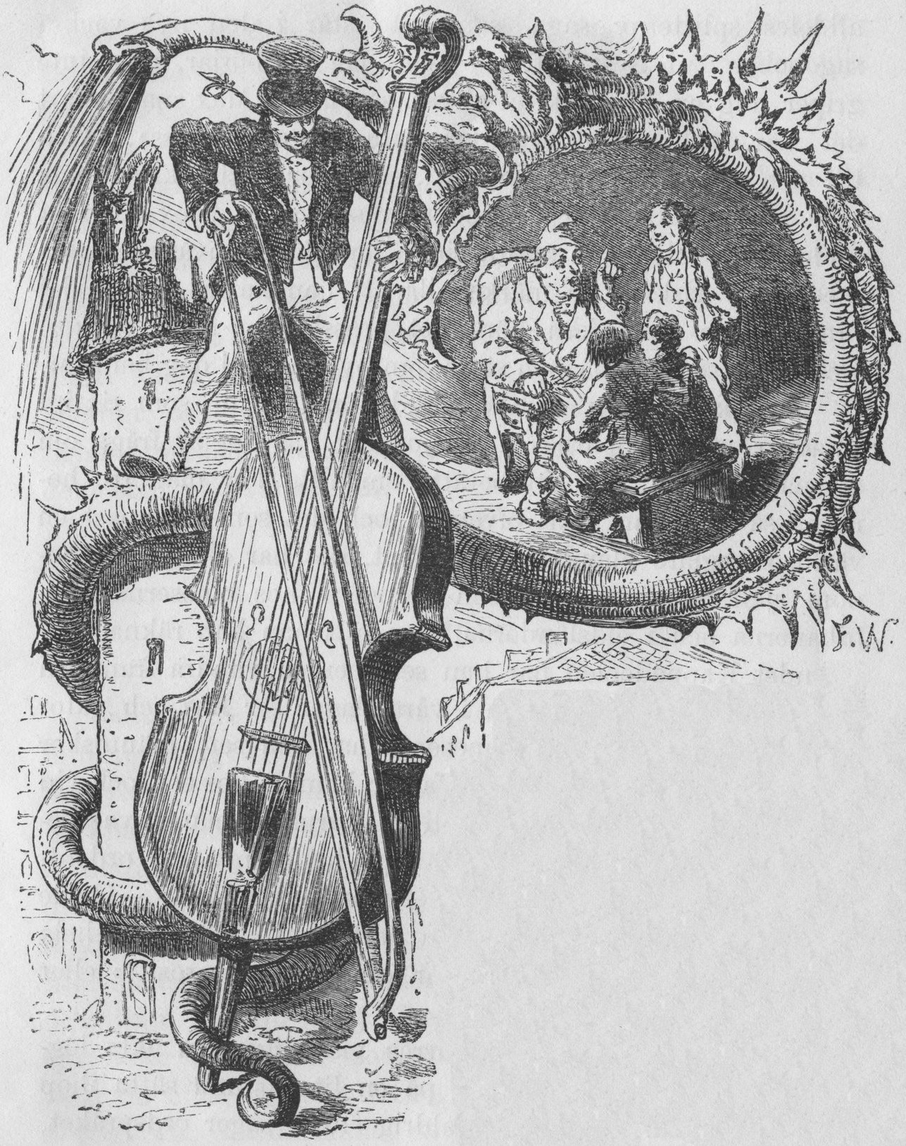 På min tid, när jag ännu var pojke, stod framför slottet ett värdshus, »gamla posten», och strax därinvid »hvita tornet». Men hvad som händt mellan »hvita tornet» och slottet — det har endast »Lögnpetter» sett. Långt innan den store fiolspelaren Paganini spelade på halfannan fiolsträng, gjorde vår lögnaktige skogvaktare på »gamla posten» bekantskap med en mycket underbarare och större mästare. Jämförd med honom var Paganini blott en fuskare. Vår landsmans vän förde nämligen med sig en tornhög basfiol, som han behandlade ännu mästerligare än den berömde genuesaren behandlade sin fiol. För att kunna spela den vidunderliga brumbasen, hade man måst taga taket af »hvita tornet»; huru skulle spelaren eljest kunnat fara upp och ned för strängarna med sin stråke? Ja, skratta ni! — som ett bevis på sanningen af saken, vågade vår landsman åberopa sig på intyget af högstsalige herr storhertigen af Darmstadt. Och då måste det väl vara sant!