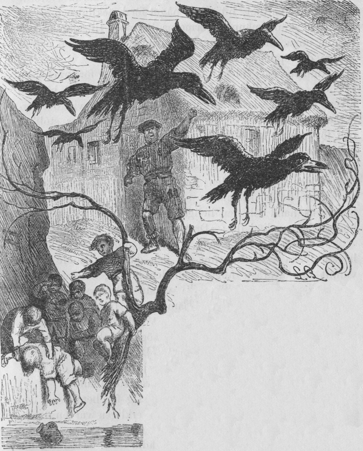 För lång, lång tid tillbaka lefde en kvinna, som hade sju söner och en dotter. Hennes man hade dött för länge sedan, och tiderna voro svåra, så att hon blott med svårighet kunde lifnära sig. Men gossarne begärde mer att äta än hon kunde gifva dem. Då utropade hon en gång förargad: »Jag önskar att ni vore korpar och sökte er föda på fältet!» Detta sade hon i en ond stund, ty med ens förvandlades de unga sönerna, flögo upp från sina stolar med svarta vingar och skyndade bort mot skogen, liksom jagade af stormvinden.