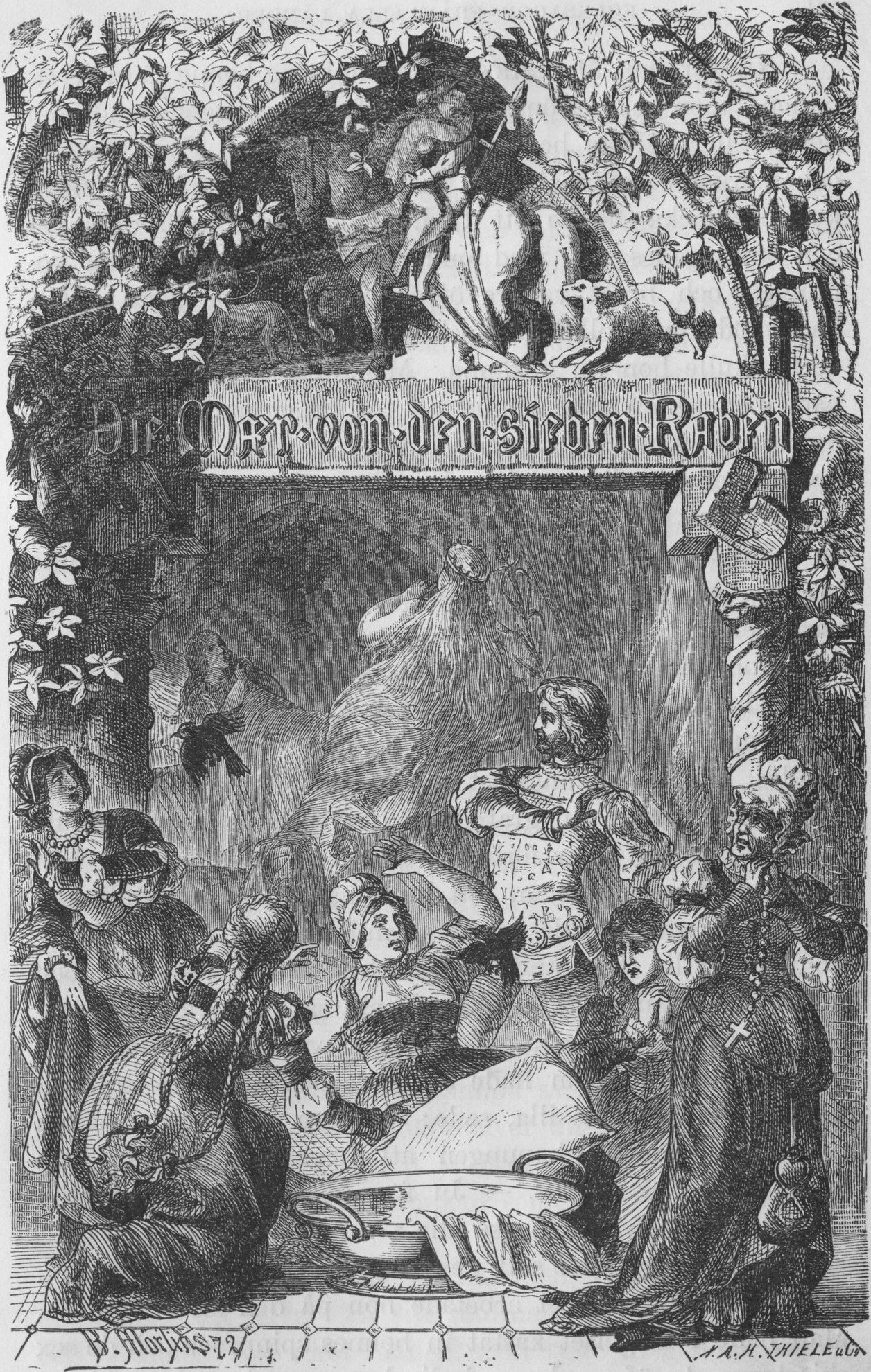 Då blef den unga flickan ensam med sin moders lik och sin smärta, men hon stannade ej hemma, utan lopp bort till skogen, i hvilken hennes bröder försvunnit. Och hon sprang in i den djupa, snåruppfyllda skogen, djupare och djupare, tills skymningen sänkte sig ner mellan träden och månen steg upp på himmelen. Då kom hon slutligen till en stor källa, som sorlade fram ur berget. Rakt öfver källan stod månen och rundt omkring susade höga furor. Flickan var trött och törstig och satte sig neder. Hon böjde sig ner till källan och drack; men vattnet hade en underbar kraft under fullmånsnätterna; och när flickan druckit, öppnades hennes ögon och ofvanför källan såg hon en hög kvinnogestalt stå, ljus och klar som solen, och vid hennes fötter fladdrade de sju korparna.