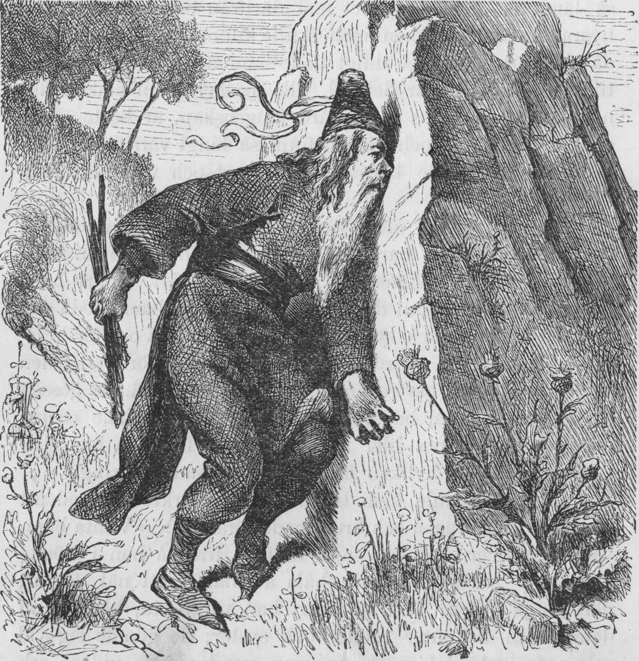 »Det var huggarn, kusin Fritz», svarade grynmjölnaren; »men emellertid finnes det underbara ting af alla slag i världen. Så komma vi snart vid andestigen, strax till vänster här i kärret, till en liten bro; där ligger lögnstenen, och den är så beskaffad, att hvar och en som samma dag ljugit eller skurit till i växten ofelbart snafvar mot den och bryter ett ben, ifall det inte går honom ännu värre. Det är en alldeles afgjord sak.»