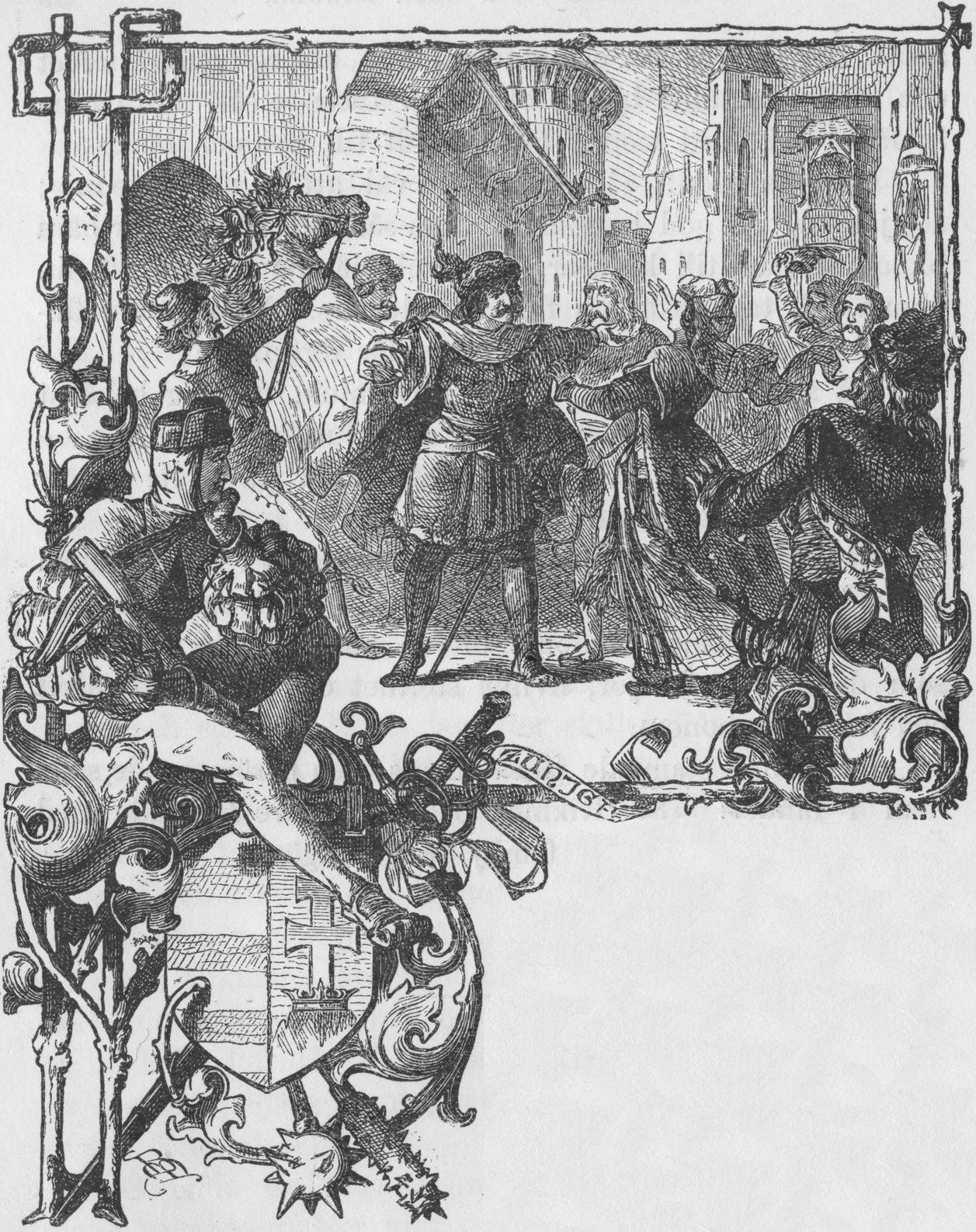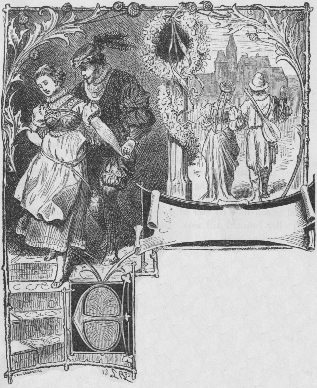 Nu klingade hornen som inbjödo till bröllopståget, klockorna ljödo från det angränsande kyrktornet och kallade de närvarande till kyrkan. Fader Anselm utbredde välsignande sina händer öfver den ädle fursten och hans folk och blickade under en innerlig bön tacksamt upp till himmelen.