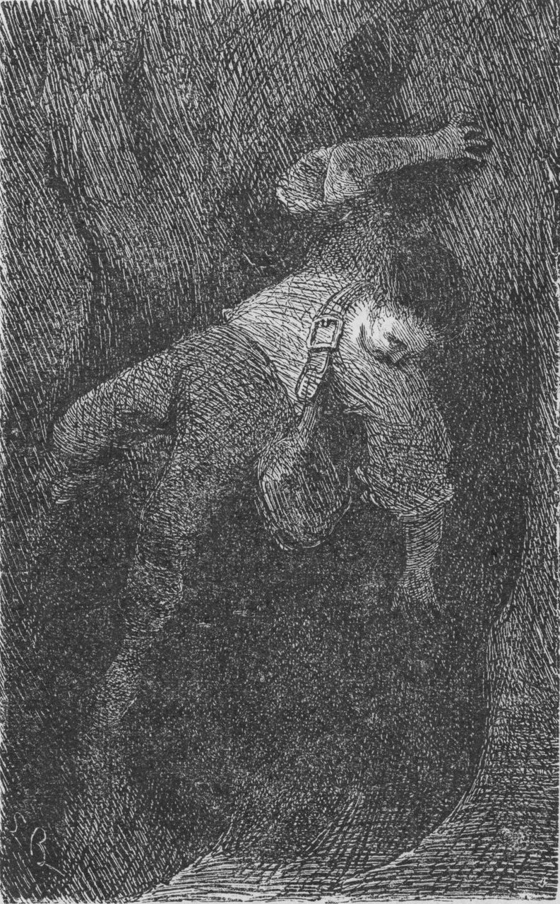 Men Lögnpetter var också en väldig jägare för Herranom. Hvad den salige herr von Münchhausen kunnat göra, det var blott en barnlek för skogvaktaren från Oberhessen. Han hade ju med tillhjälp af sina taxhundar fångat en hvalfisk tre mil ifrån land, hvilken hvarje sekund sprutade ut ett oxhufvud äppelvin med seltersvatten. Dock erkände hvalfiskjägaren att han hade haft mycket besvär med att föra sjöodjuret i land, och att äfventyret skulle varit honom omöjligt att bestå, om han ej hade haft sin springpojke till hjälp. Denne, som knappast var halfannan aln hög, var hemma i Vogelsberg. Där hade han gått ut på spaning efter den fruktade röfvarhöfdingen Schinderhannes, som tagit sin tillflykt där i skogen. På en promenad från Rhen till Rhône hade han nämligen gått vilse, och hade nu från Spessart kommit in i Oberhessen. Petters lifdvärg hade nu stött på den vildsinta människan i närheten af Bildenkopf och gifvit sig i strid med honom. Hela åtta dagar varade deras kamp. Och under den tiden kunde båda två helt ledigt låta solen lysa igenom deras magar, ty hvarken mat eller dryck fanns på platsen, och äfven om sådant funnits, hade de ej gifvit sig tid att äta, så inne voro de i sin strid. Men ändtligen fick dvärgen omkull flyktingen, på hvars hufvud man hade satt ett högt pris, och ritsch, ratsch — ty han hade klokt nog tagit med sig hvad han behöfde — fick han fatt i en gammal potatissäck, som låg i närheten, och i den stoppade han sin fånge utan vidare omständigheter. Med denna börda på ryggen hade han irrat omkring tio mil hit och dit, och Lögnpetter, som sökte honom, följde efteråt med sin hvalfisk och sin taxhund. Ändtligen på elfte dagen träffade den lille hjälten på den store, sin herre. Nu gick saken betydligt bättre: de båda hjälpte hvarandra ömsesidigt, i det de turade om med sina bördor. Men när de ej orkade mer, gjorde Petter kort process och upphängde, utan att länge besinna sig, säcken med den sprattlande röfvarhöfdingen vid ett mastträd, minst tusen fot högt, om ej högre. Där lät han nu Schinderhannes helt beskedligt hänga, och gick vidare som om intet hade händt. Men omkring honom, som var instoppad i säcken, samlade sig ett snyggt sällskap, bestående af en sönderrifven tiggarpåse, en ölmugg utan botten och lock, en skaftlös knif utan blad samt en eldgaffel utan klor, som samtliga sökte en fördelaktig anställning. Men de funno snart svåra medtäflare i en trefot med fyra fötter, ett halster utan mellanrum mellan gallren, ett tomt fat utan botten och sidor, hvaröfver en sparf gjorde sig lustig, hvilken för öfrigt hos Petters dräng lade sig ut för röfvaren i säcken, så att denne bogserade sig ner för trädet och lyckades komma i säkerhet. Men hela sällskapet begaf sig därifrån då det såg att en lam man på ett ben af alla krafter sprang efter en hare och att han i stället för haren endast fick ett öra, som denne tappat. Men haren fångade en naken groda och stoppade henne i sin ulliga ficka. Och allt detta såg en blind, som ej kunde tala och som därför ropade »tjufvar och mördare», och som vidt och bredt utbasunade hvad han hade sett för alla människor, som bodde i en människotom öken.