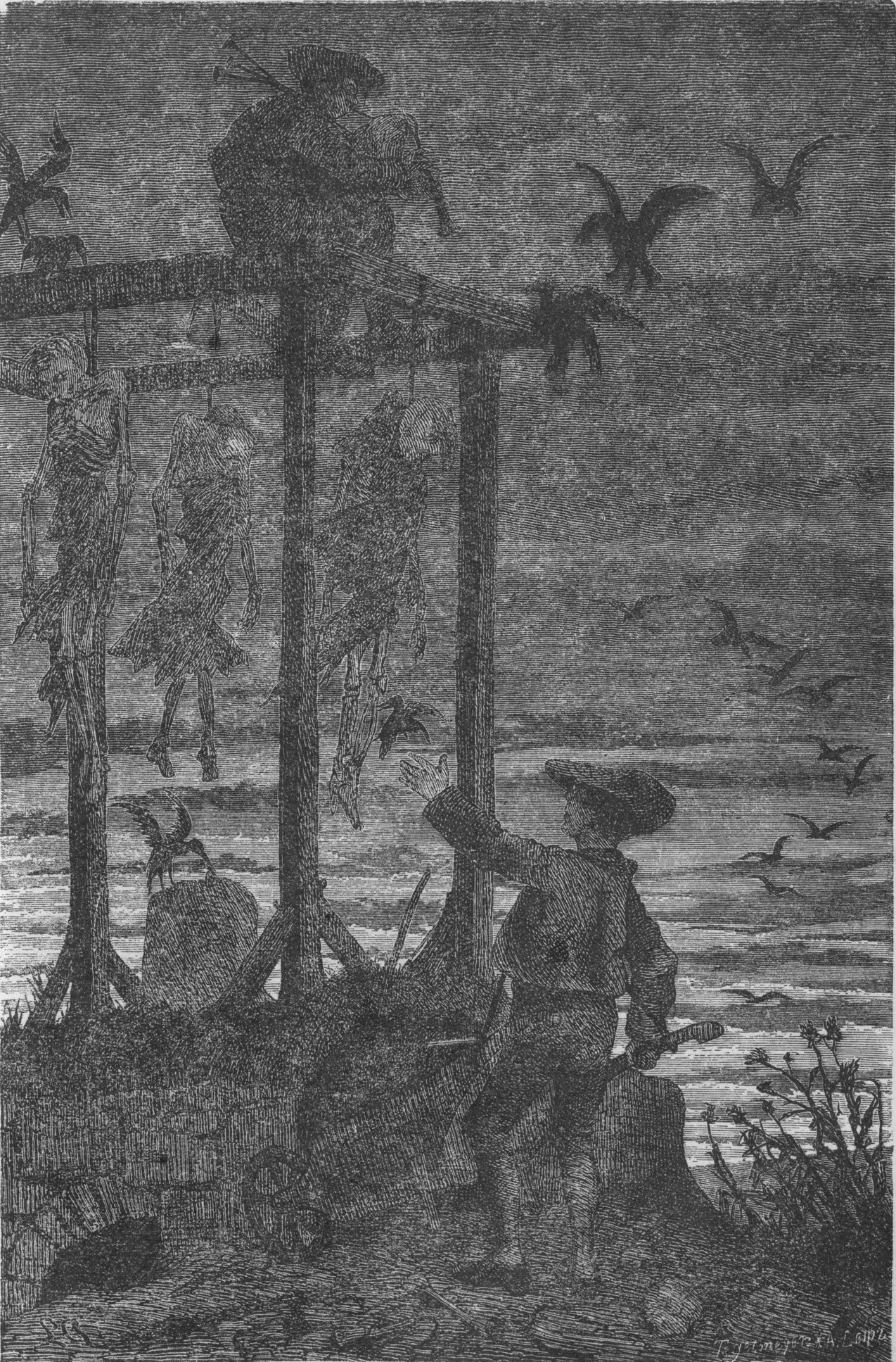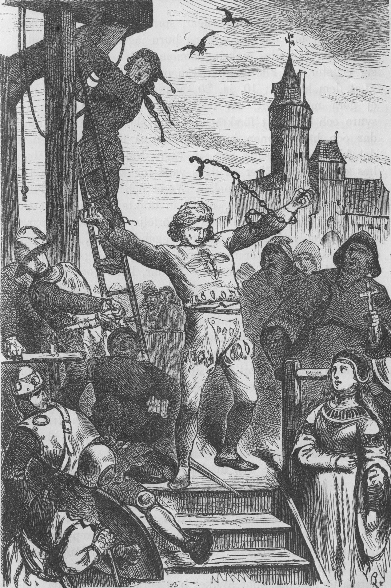 När det blef svalare och morgonstjärnan var i sitt nedstigande, då flögo korparna med jämmerskri mot skogen, och när den första solstrålen visade sig, då inträdde bödelsdrängarne i den hulda kvinnans fängelse.