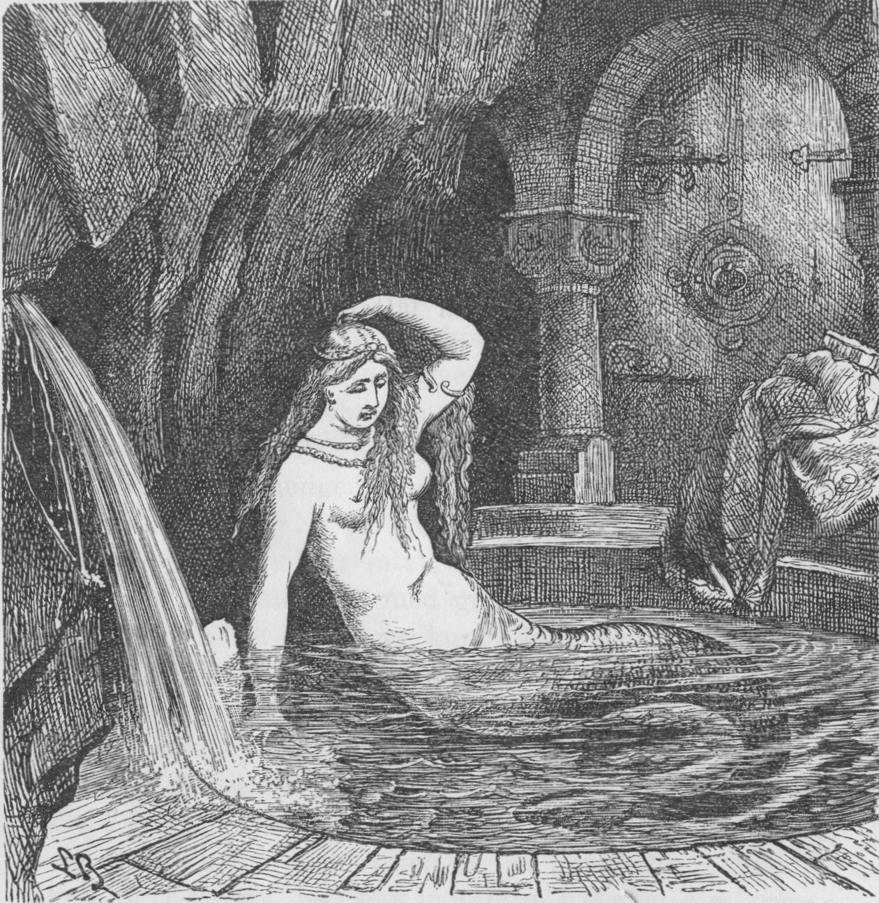 Korparna tillförde henne föda, ur källan drack hon och med dess vatten badade hon sin kropp, så att hon för hvarje dag blef skönare. Sommar och vinter gick förbi, hennes kläder föllo sönder till stoft, men hon insvepte sig i sitt gyllene hår, som föll omkring henne som en mantel.