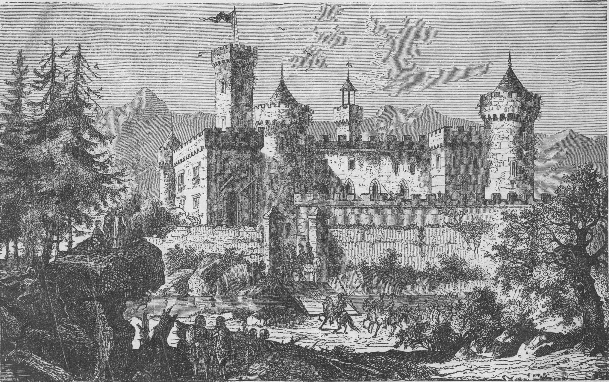 Och borgen låg i den glänsande aftonrodnaden med skimrande tak och höga tinnar och skådade från berget vida öfver ett blomstrande land.